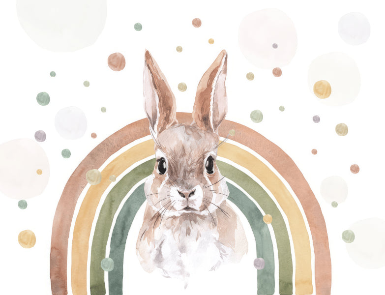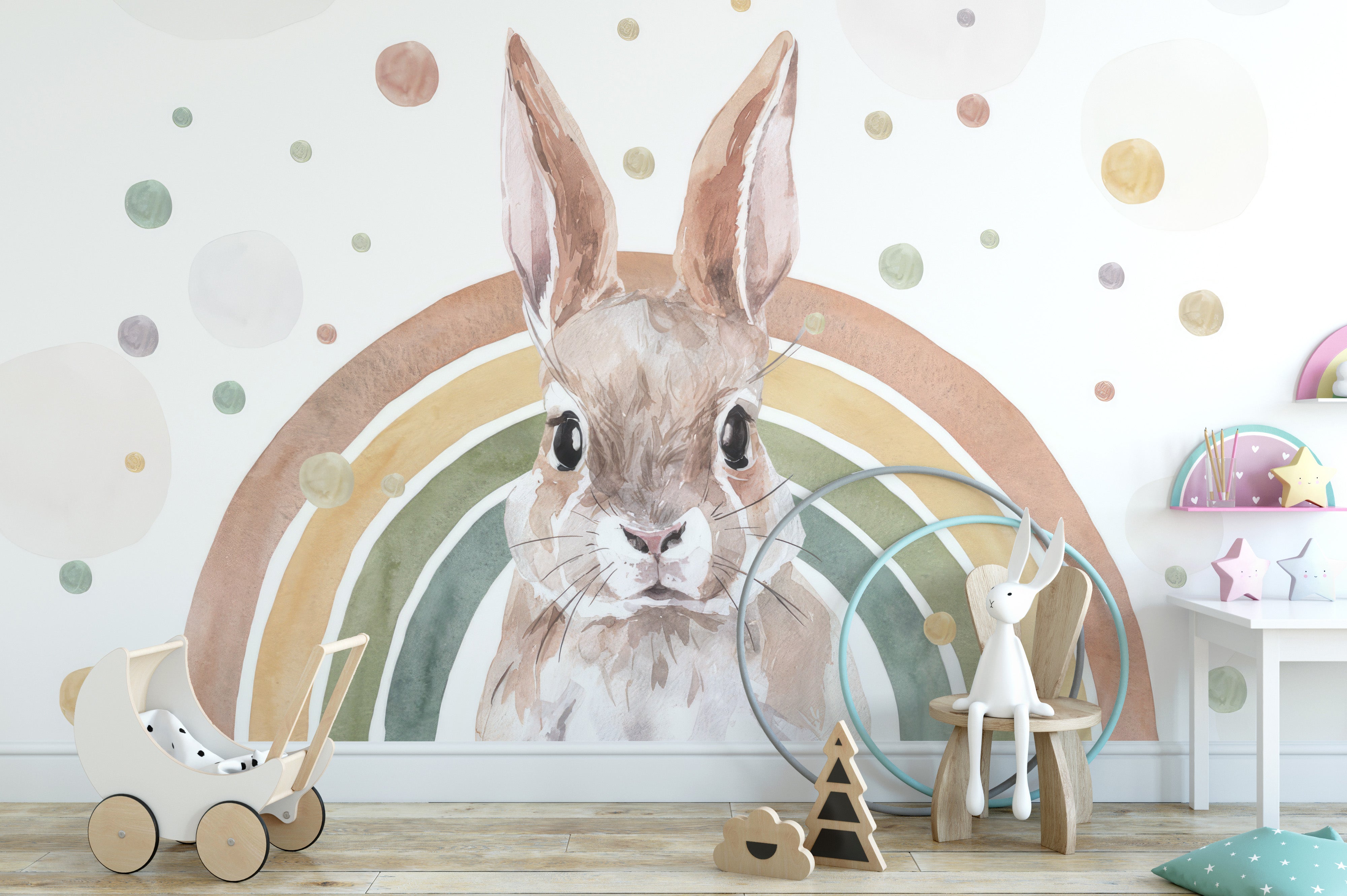Brighten your little one's nursery with a kids nursery wallpaper featuring the joyful rainbow rabbit. This mural brings a splash of color and a dash of whimsy to playtimes and bedtime tales alike. Cheerful and vibrant, it captures the imagination, inviting young minds on a magical journey of discovery. Perfect for a touch of charm, this design makes every moment in the nursery a hop, skip, and a jump away from ordinary.