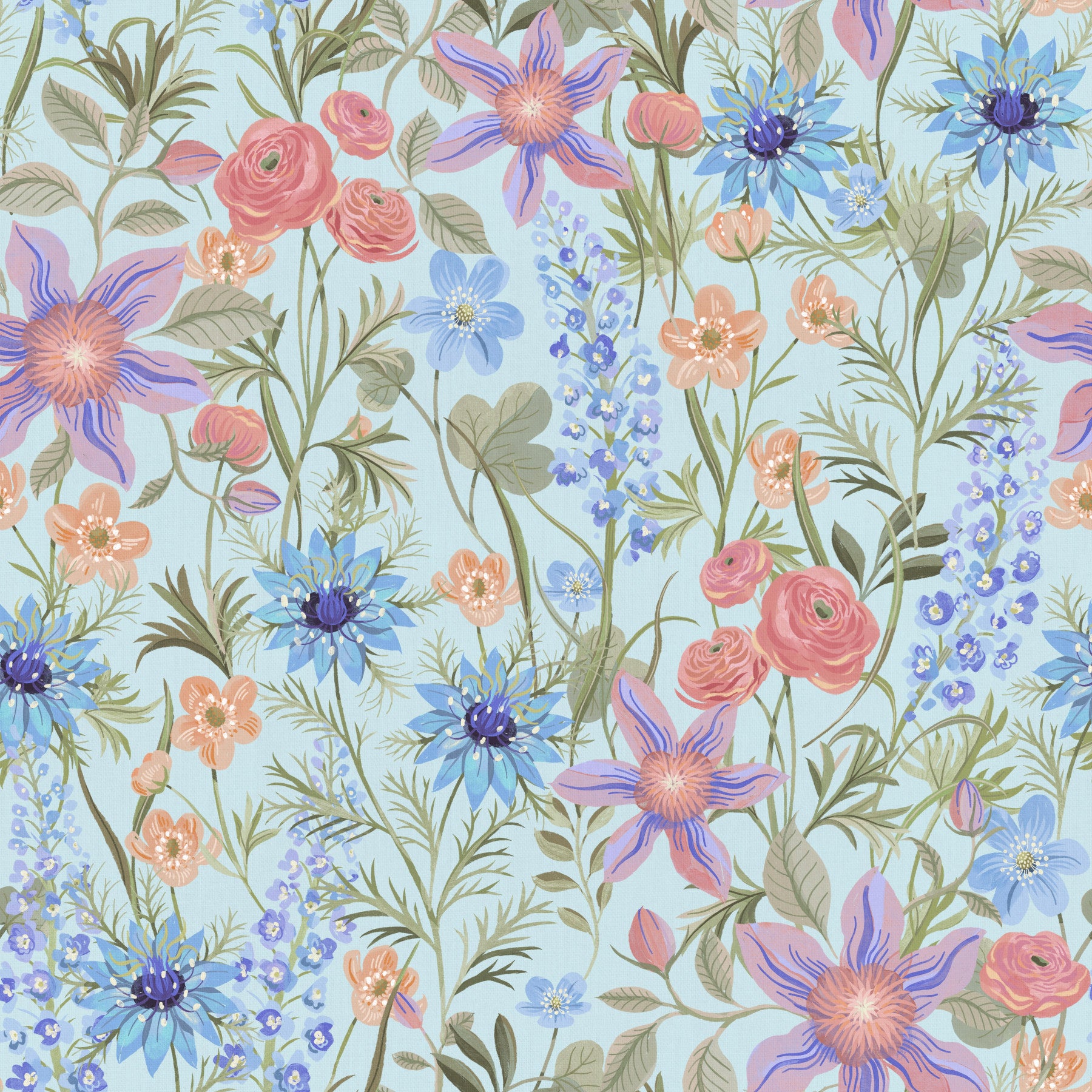 Sky blue wallpaper with retro ranunculus florals