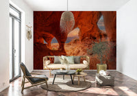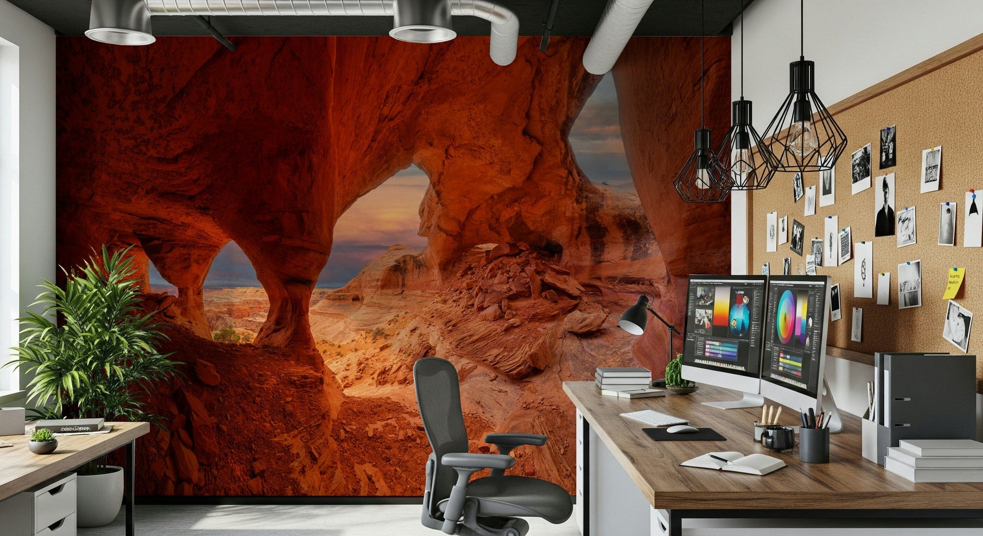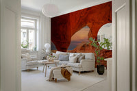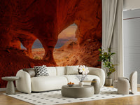 Transform any space with the drama of Red Rock Arches. This design features natural rock formations bathed in warm, sunset hues. This wallpaper for walls brings a sense of adventure and the outdoors inside. Imagine this design in your bedroom, study, or even a hallway. The earthy tones and unique perspective complement modern, minimalist, or bohemian styles, making it a versatile addition to your home decor. The archways add visual intrigue and a feeling of spaciousness.