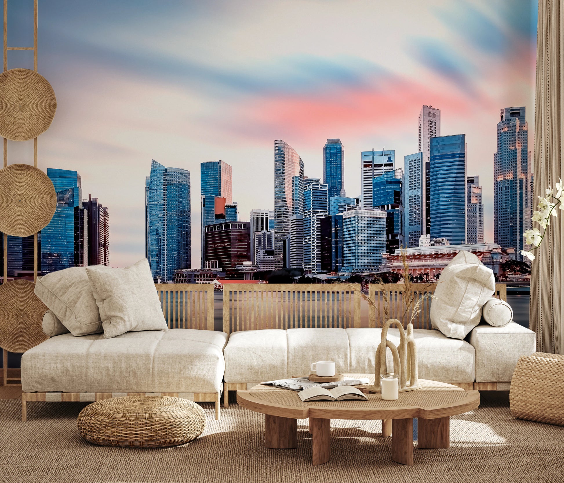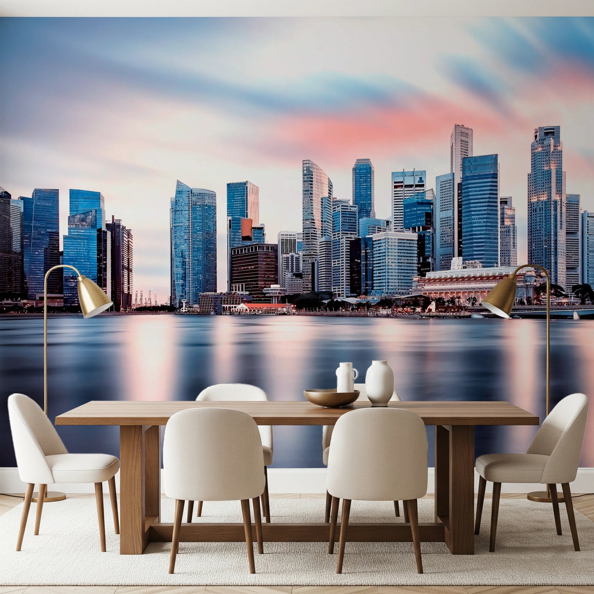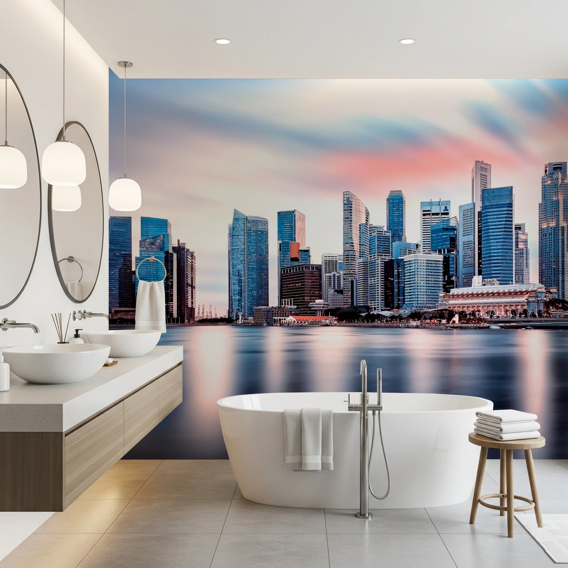 This sophisticated skyline wallpaper design creates a tranquil ambiance with its modern aesthetic. The city architecture is balanced with water reflections. Shades of blue intermingle with soft pinks, bringing an element of serenity to any space. Ideal for those seeking a contemporary style, this wallpaper for walls enhances rooms with a sense of calm and depth. Consider using this in bedrooms or home offices. The water reflection effect can create an illusion of more open space.
