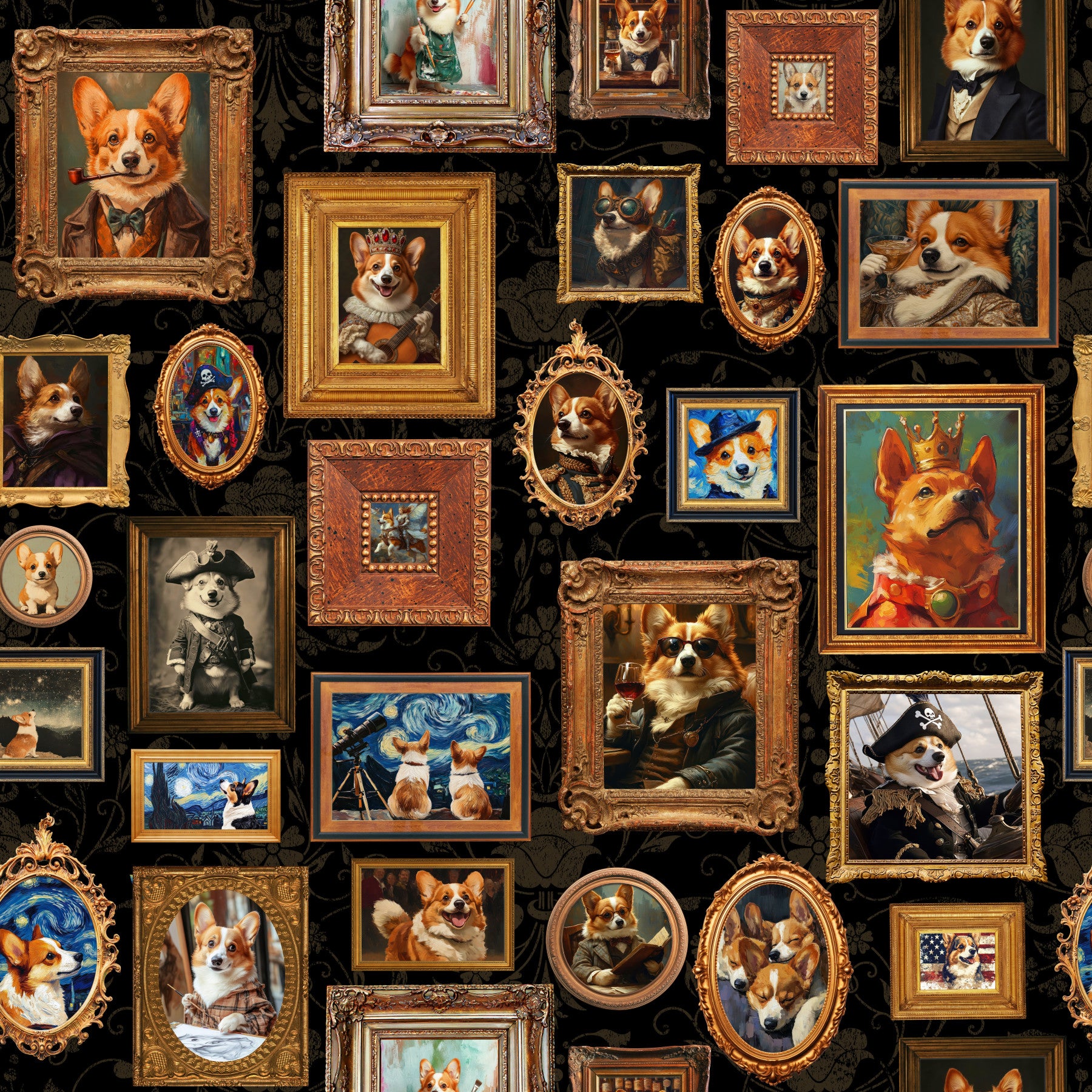 Step into a world of canine aristocracy with this unique wallpaper by Uta Naumann. Displaying Corgis portrayed in various historical and whimsical roles, each framed portrait adds a touch of class to any room. The elegant gold frames contrast beautifully against a floral-patterned black background. This wallpaper for walls gives a sophisticated look, ideal for a living room, study, or dining area. It introduces both charm and grandeur to your interiors, making it a great conversation starter.