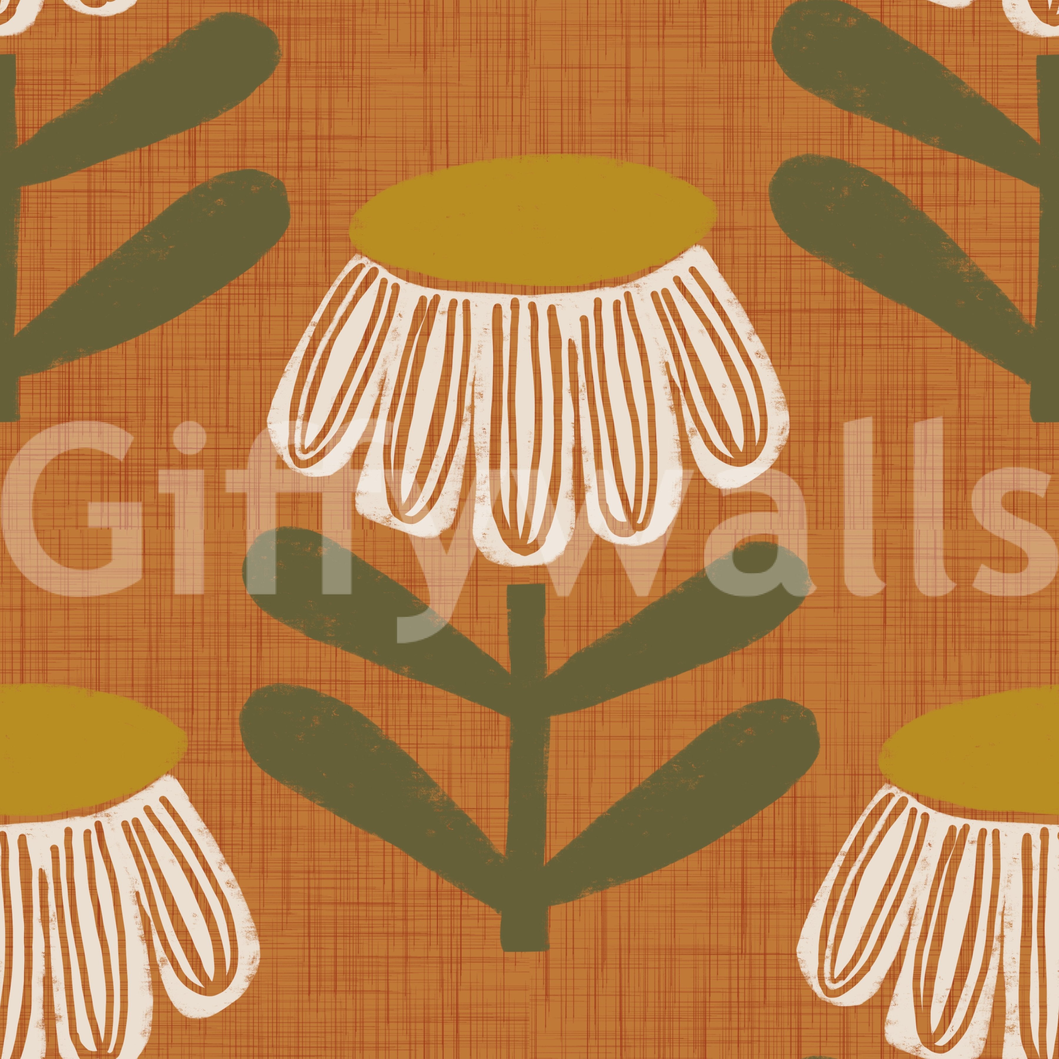 Embrace mid-century modern style with this stunning wallpaper featuring stylized daisies in a warm burnt orange palette. The design boasts a textured linen background, enhancing the retro aesthetic. Simple yet elegant, the off-white daisy petals are accented with a mustard yellow center, complemented by olive green leaves. This captivating pattern perfectly captures the charm of vintage floral design, offering a sophisticated and calming atmosphere for any room. The clean lines and bold color choices create a visually appealing contrast against the soft, textured background. Perfect for adding a touch of nostalgic elegance to your home.