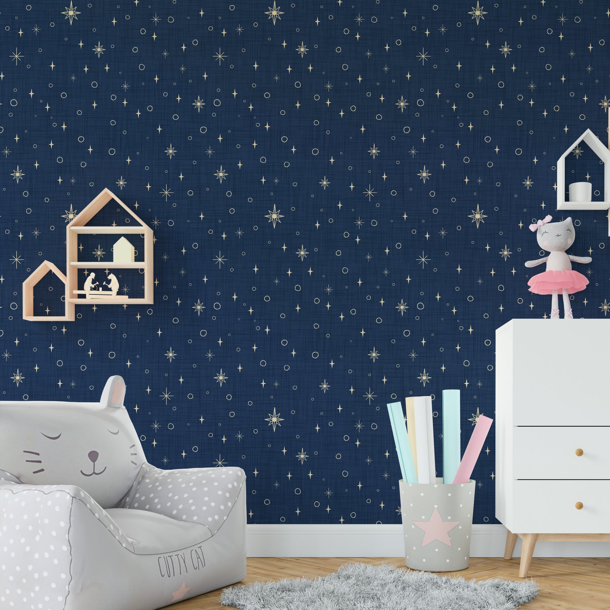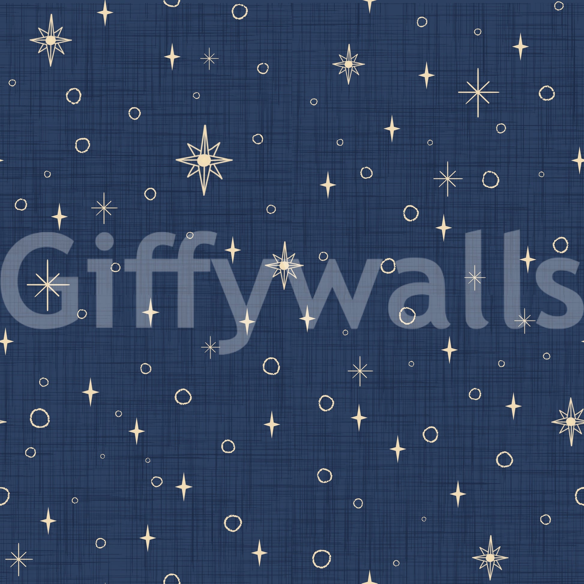Embark on a celestial journey with this retro-inspired wallpaper, reminiscent of vintage nautical charts under a starlit sky. The deep blue backdrop, textured with a subtle linen-like weave, evokes the vast ocean depths. Scattered across this midnight canvas are stylized stars in warm, burnt amber hues, from simple crosses to intricate multi-pointed designs. Tiny, minimalist circles punctuate the design, creating a whimsical, retro feel. This pattern offers a calming and sophisticated aesthetic, perfect for creating a unique and inviting space, blending classic nautical charm with a touch of mid-century modern flair.