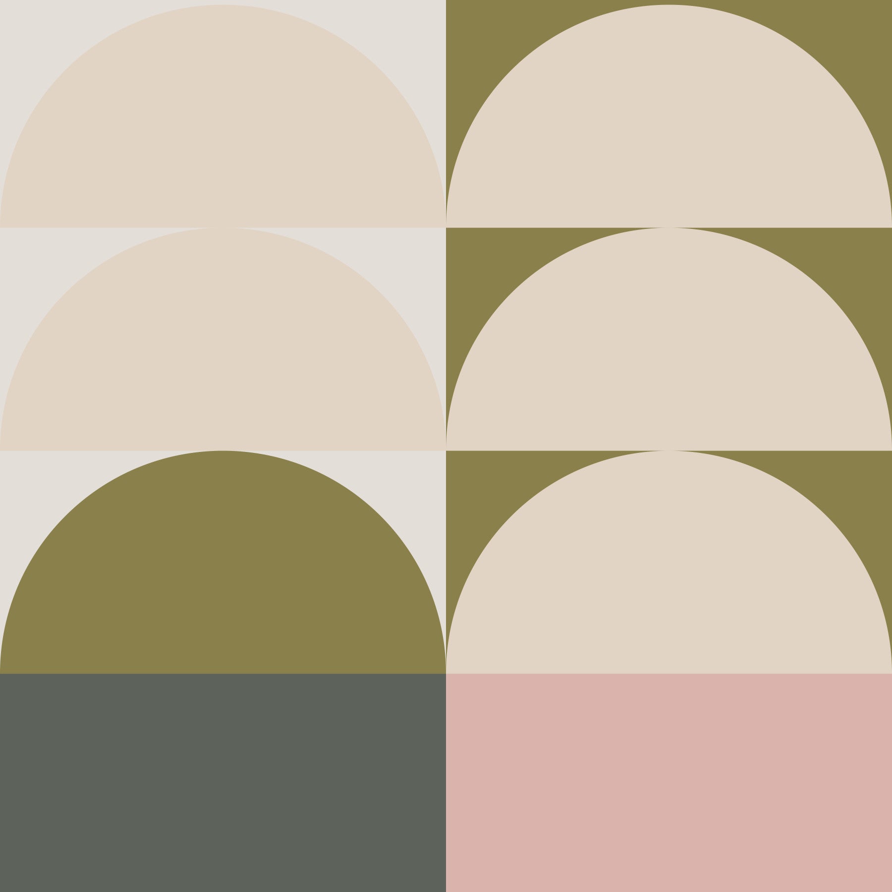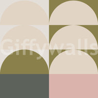 Mid-century inspired sunrise mural with bold shapes and soft gradients in a panoramic layout.