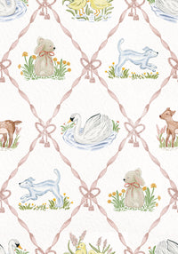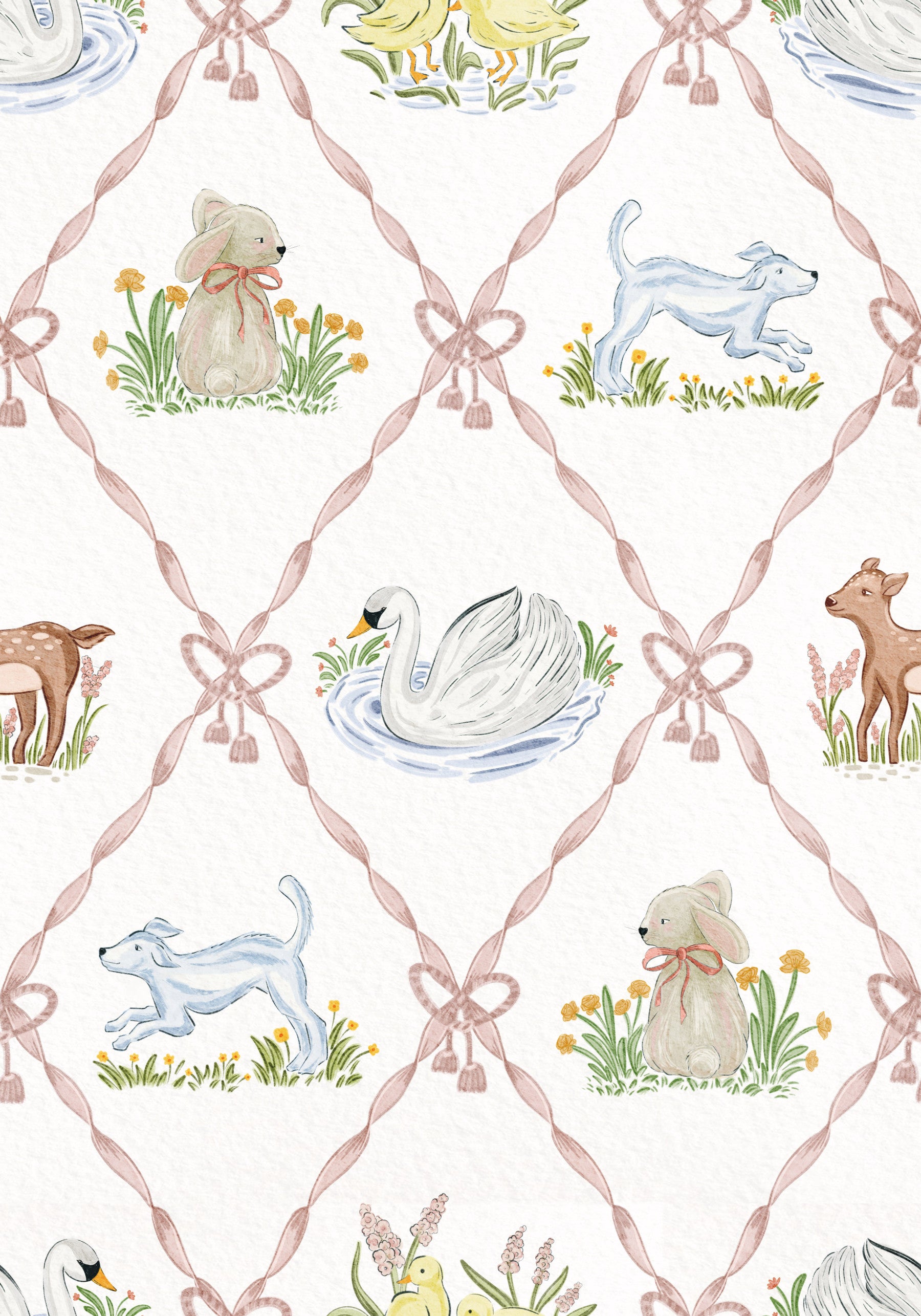 This delightful wallpaper is a perfect blend of classic charm and modern aesthetics. The watercolor illustrations feature adorable animals—bunnies, puppies, swans, and deer—set against a soft, off-white background. A whimsical pattern of delicate, intertwined ribbons adds a playful touch, creating a sophisticated yet child-friendly design. The pastel color palette evokes feelings of peace and tranquility, making it ideal for nurseries, children's bedrooms, or playrooms. The soft, hand-drawn style adds a touch of personalized charm, transforming any space into a captivating and joyful haven.