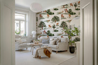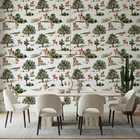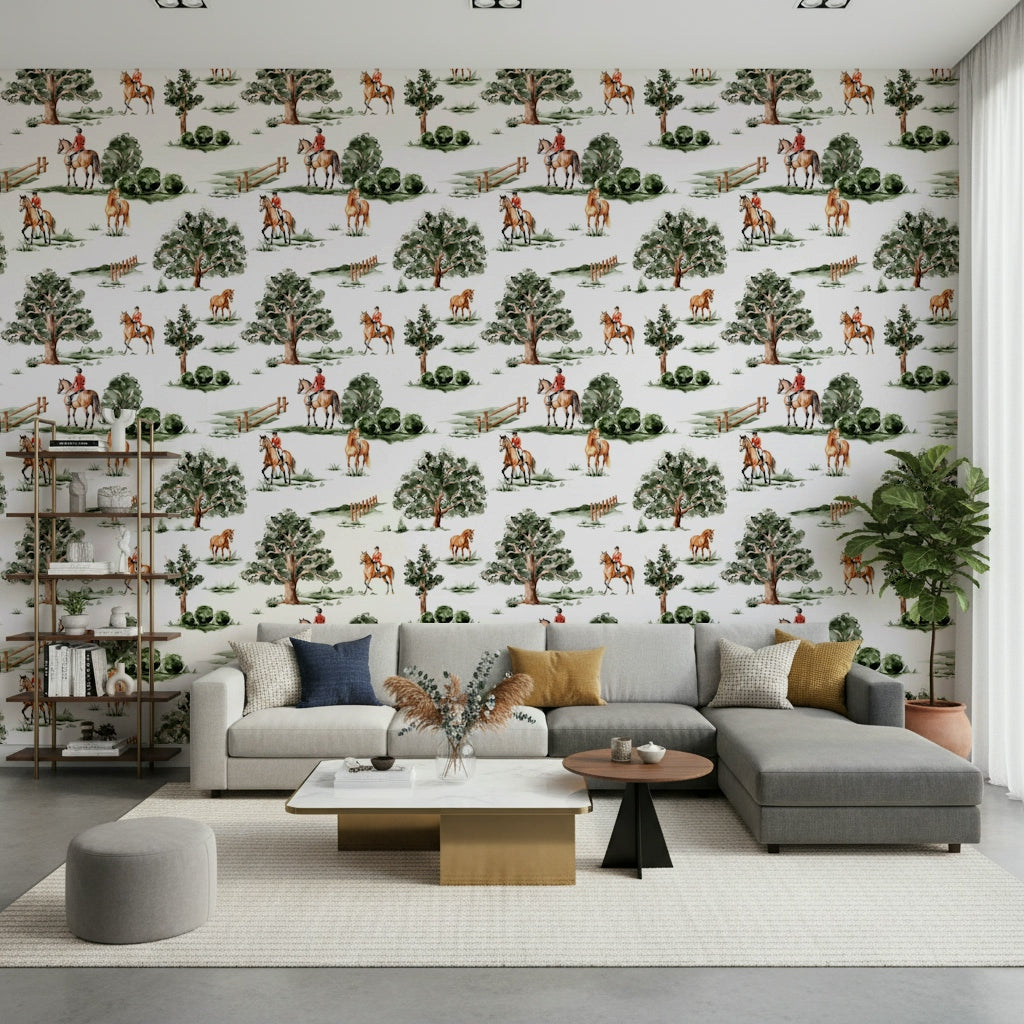 This watercolor-style wallpaper features horses and riders amidst a serene, green landscape by Uta Naumann. The earthy tones and delicate brushstrokes create a peaceful mood. Imagine walls adorned with this scene of riders and horses, inviting a sense of nature into your home. This wallpaper for walls offers a timeless charm perfect for a study, library, or even a dining room, creating a sophisticated atmosphere. The repetitive pattern makes it ideal for larger spaces, adding both depth and a touch of artistic flair. Let it transport you to the tranquil countryside.