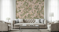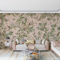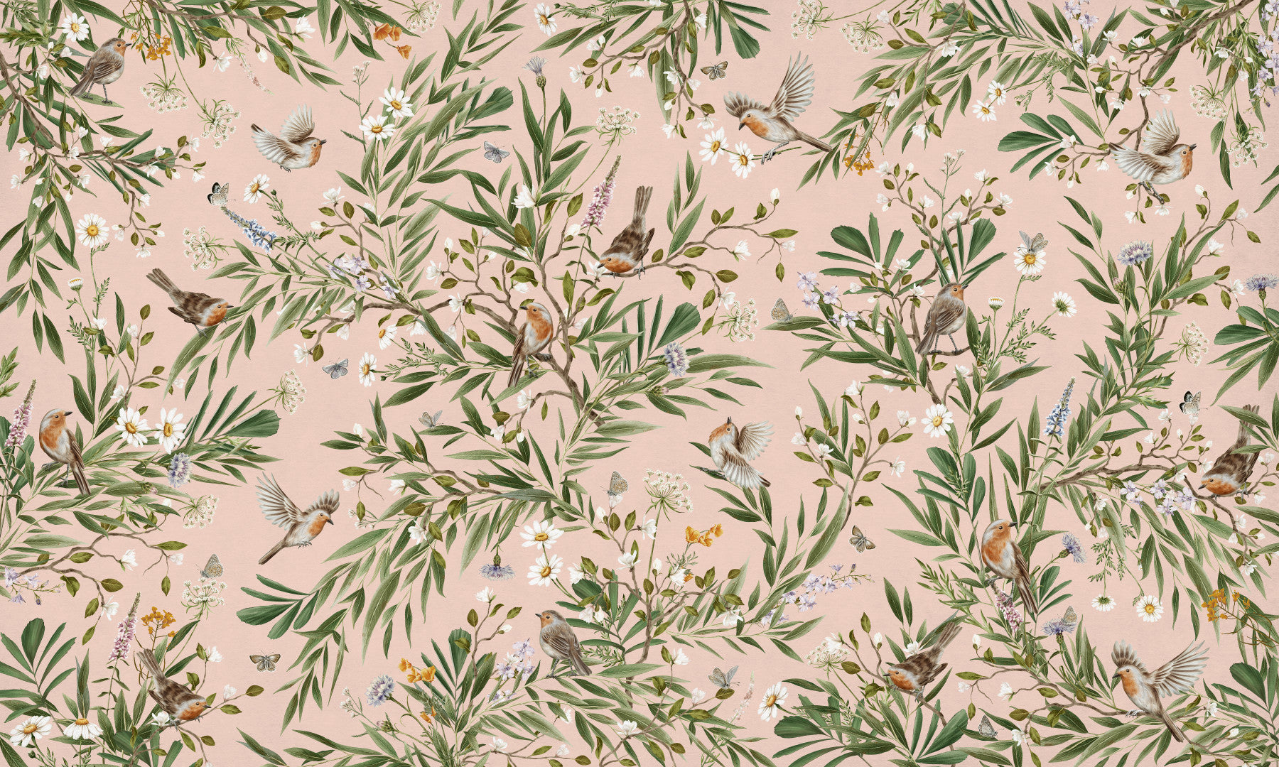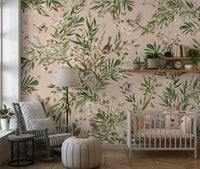Elevate interiors with this serene wallpaper for walls that features robins gracefully perched amongst flowering branches. The blush pink background gives a gentle contrast. It promotes a light ambience and adds to the elegance of the overall design. This pattern looks perfect in bedrooms, living rooms, or a nursery and gives the place an outdoor vibe. The calming nature theme will enhance the relaxing atmosphere of any room.