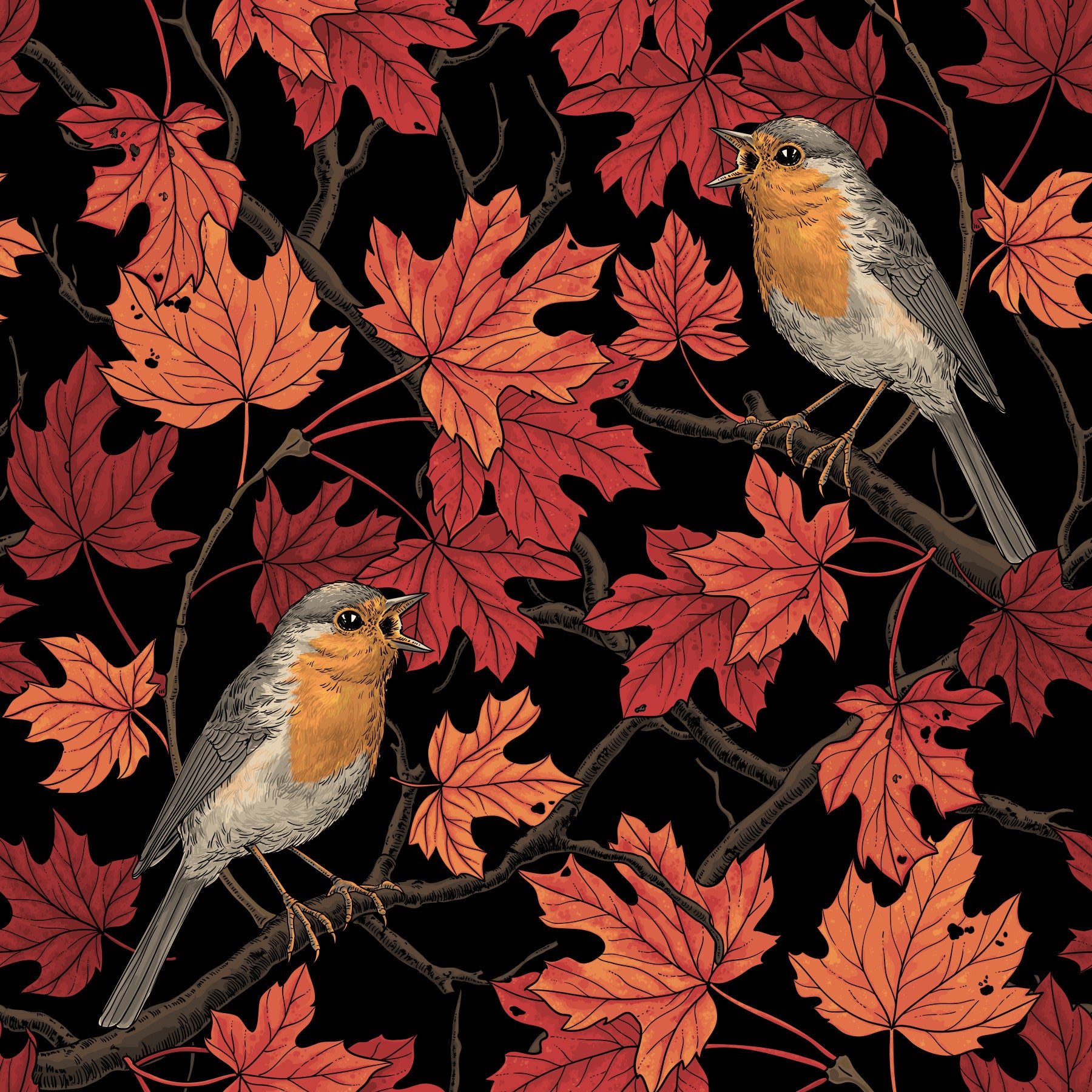 Robins Perched on Maple Tree Wallpaper – Elegant nature-inspired design with vibrant birds and rich foliage on black.