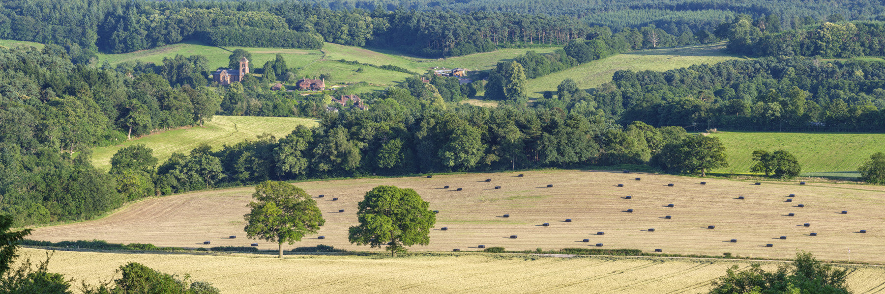 England hills. Envelop your space in the charm of the countryside with this breathtaking wallpaper for walls. Lush forests meet gentle hills, and the fields host scattered hay bales under a soft, welcoming light. The design offers a tranquil escape, perfect for creating a relaxing ambiance. Introduce this pastoral scene into your living room or bedroom to enhance the interior, providing a comforting backdrop that soothes the mind and brings a touch of nature indoors.