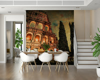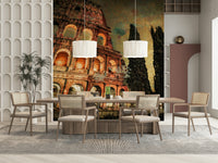 This dramatic wallpaper presents a unique perspective of the Colosseum at night. The artistic treatment uses a blend of photographic detail and painterly brushstrokes, giving the image a rich, textured feel. The warm amber lighting on the ancient structure is strikingly juxtaposed against the dark, imposing cypress trees. The overall color palette is moody and evocative, featuring deep browns, oranges, and blacks that create a sense of mystery and history. Perfect for those who appreciate bold aesthetics and historical subjects, this wallpaper will add a dramatic flair to any room.