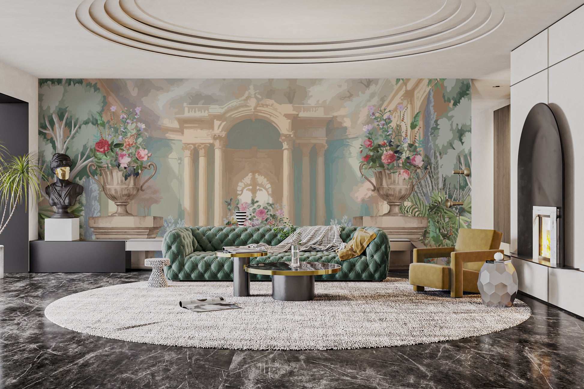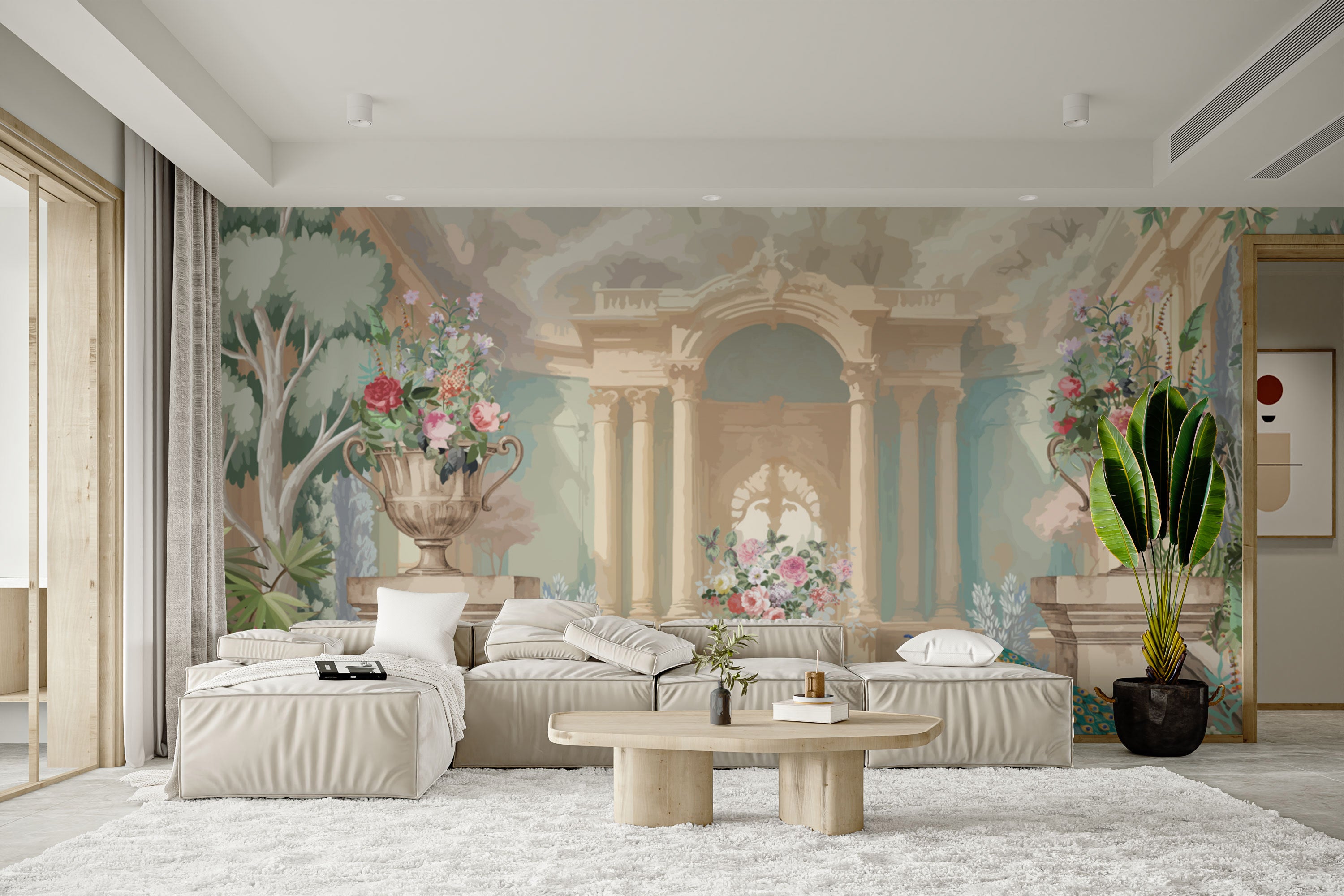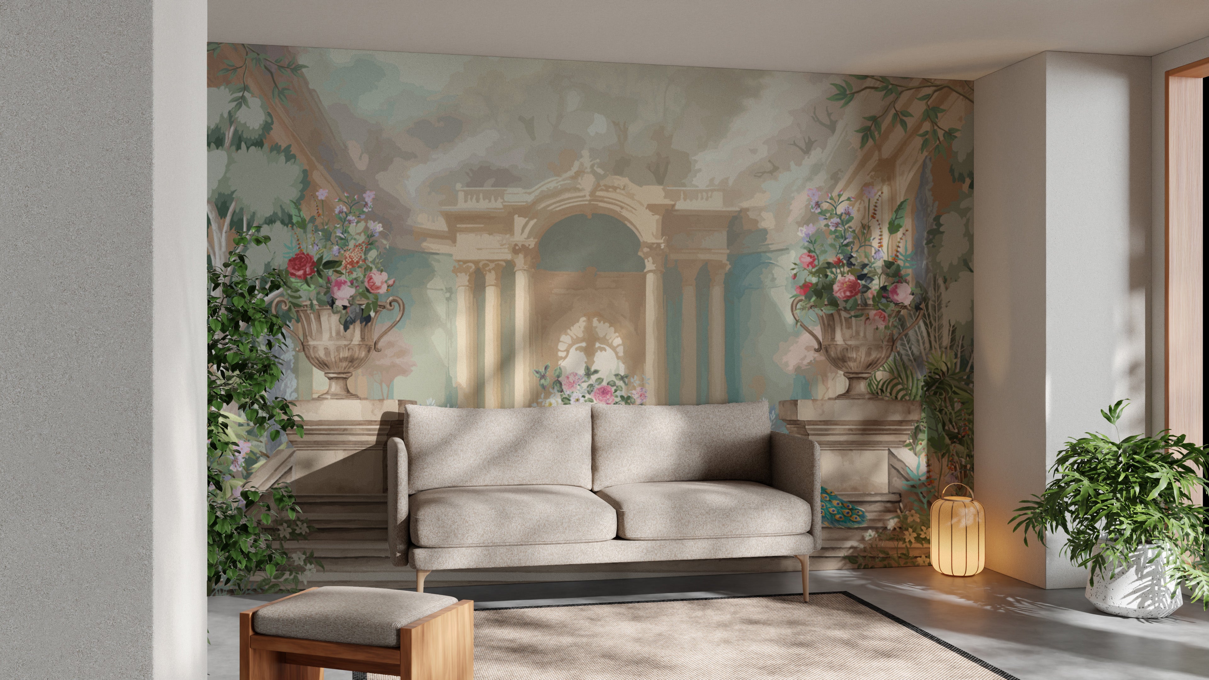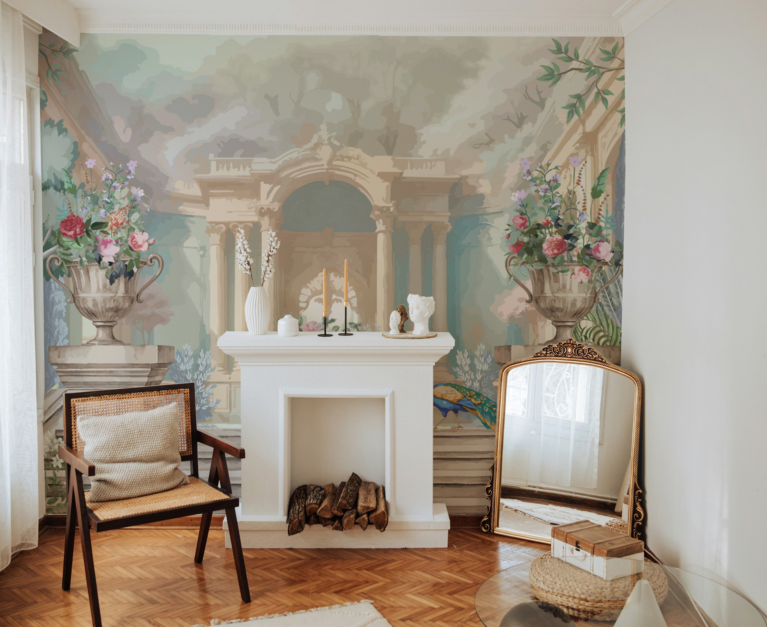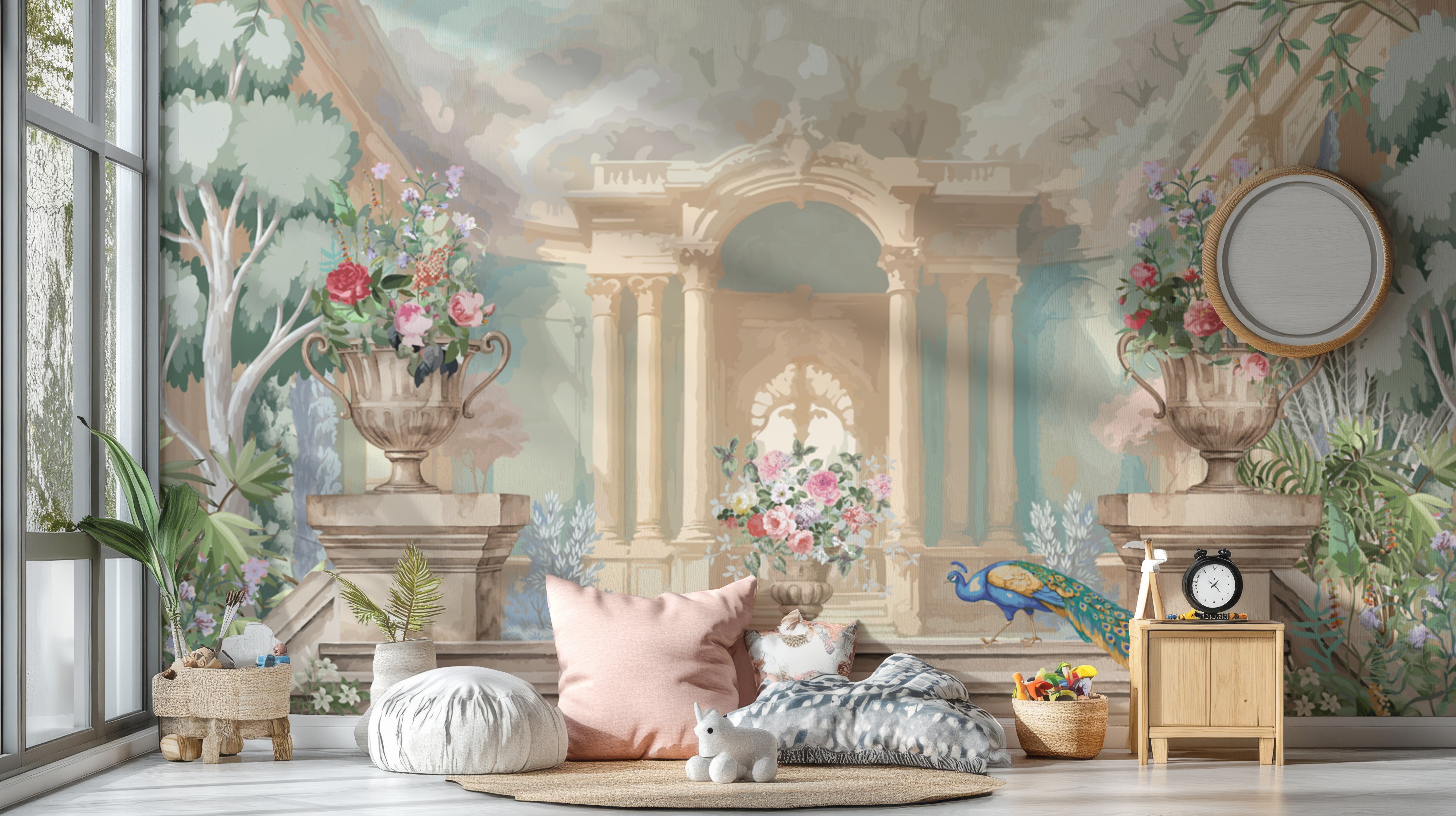 The Royal Peacock Palace Garden Mural brings a touch of elegance with its grand palace entrance, intricate floral arrangements, and a majestic peacock. Soft watercolor hues blend with classical architecture, creating a luxurious atmosphere. The peacock in the palace garden wallpaper enhances any interior with its regal charm. Towering columns, ornate flower vases, and lush greenery evoke timeless sophistication. The vintage floral garden mural pairs beautifully with classic and modern interiors. The misty background adds depth, making rooms feel spacious. This grand palace garden mural is ideal for bedrooms, living rooms, or hallways, creating a refined and graceful setting.
