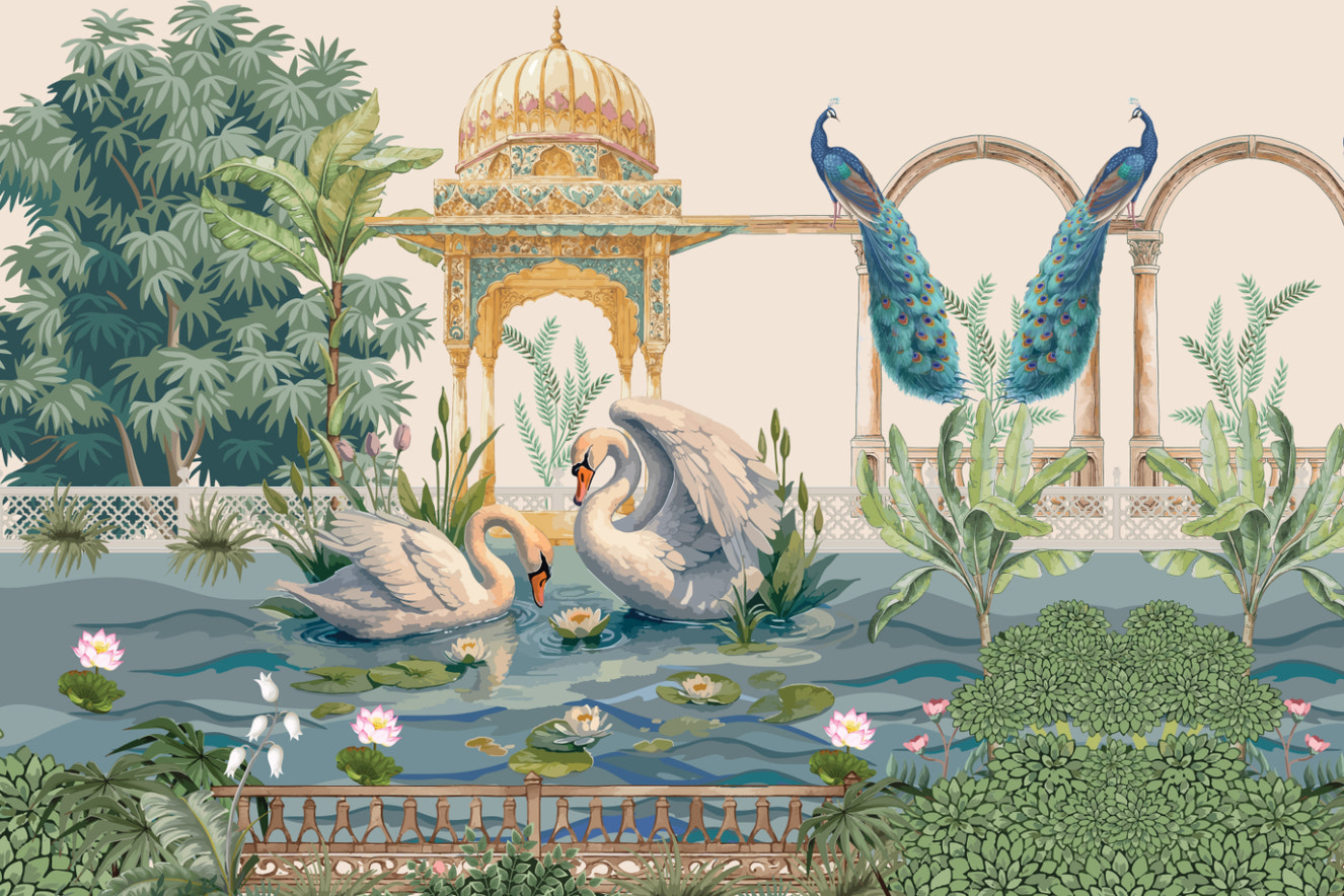 Indian Palace Garden Wallpaper Mural with swans and pond