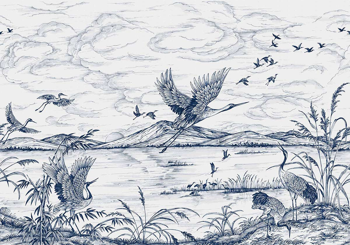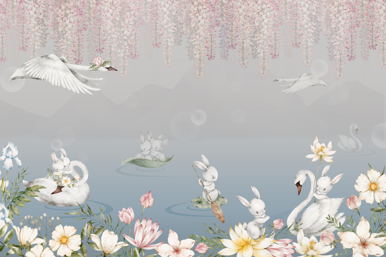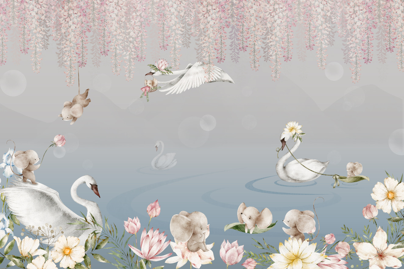 Peacock and Swan Lake Wall Mural in royal garden setting