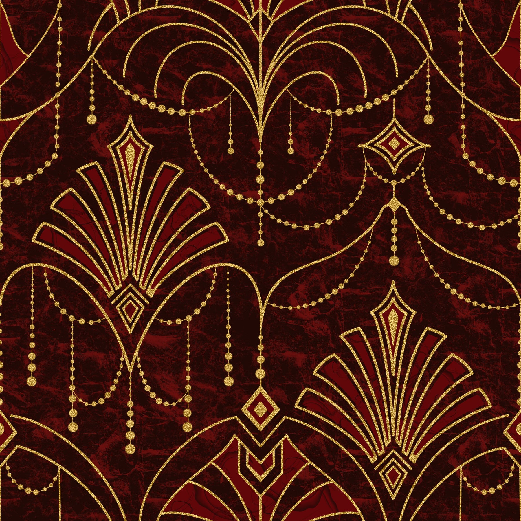 Elevate your interiors with this stunning art deco wallpaper. It marries geometric shapes and shimmering gold on a deep ruby canvas. Imagine this wallpaper for walls in a dining room, adding a touch of vintage grace to every meal. Or perhaps in a hallway, crafting an entryway statement. The bold design shines in classic, art deco, or luxurious interiors. Let it cast a striking backdrop for your home.