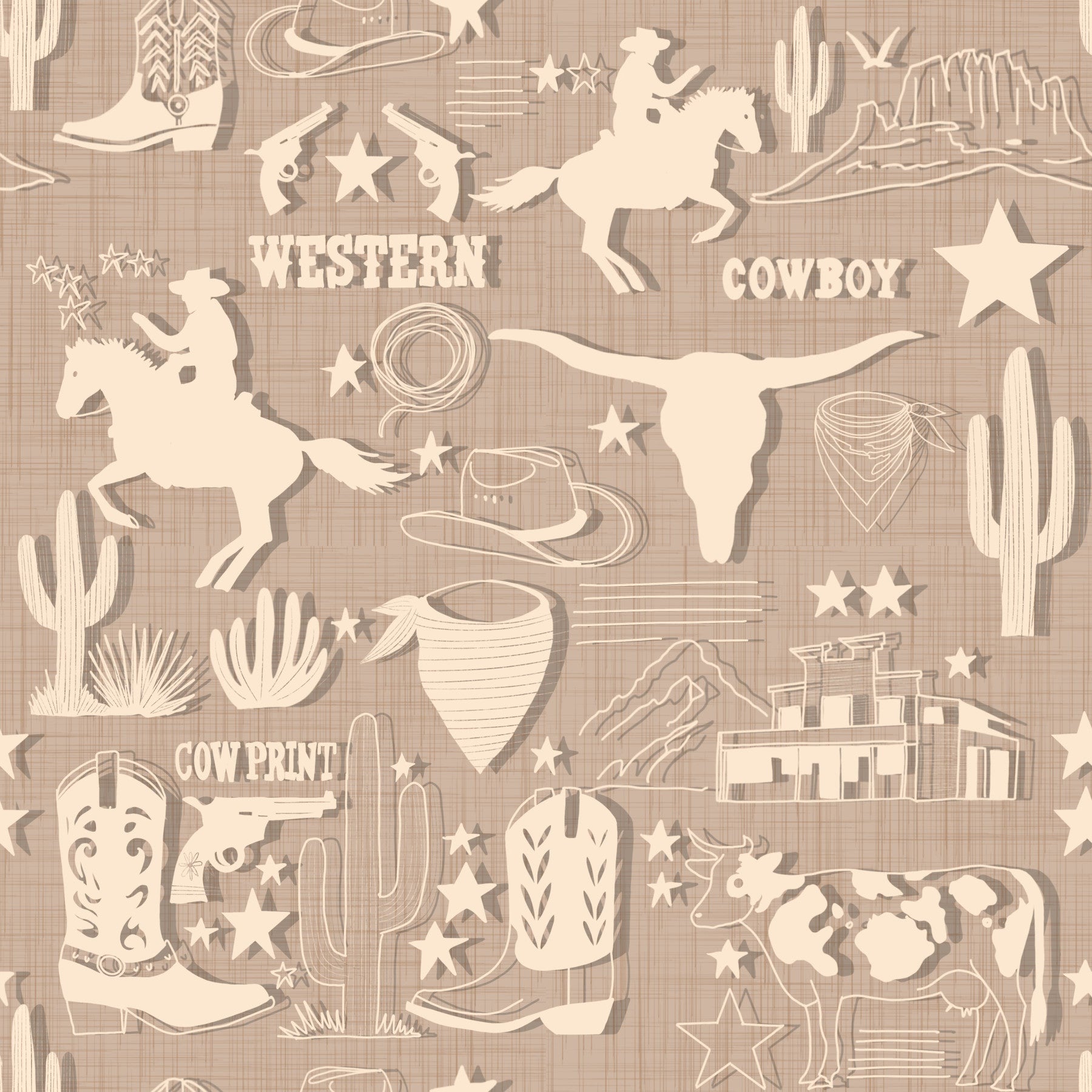 Rustic Cowboy Dream wallpaper featuring western-themed icons like cowboys, cacti, boots, and longhorns in soft beige tones.