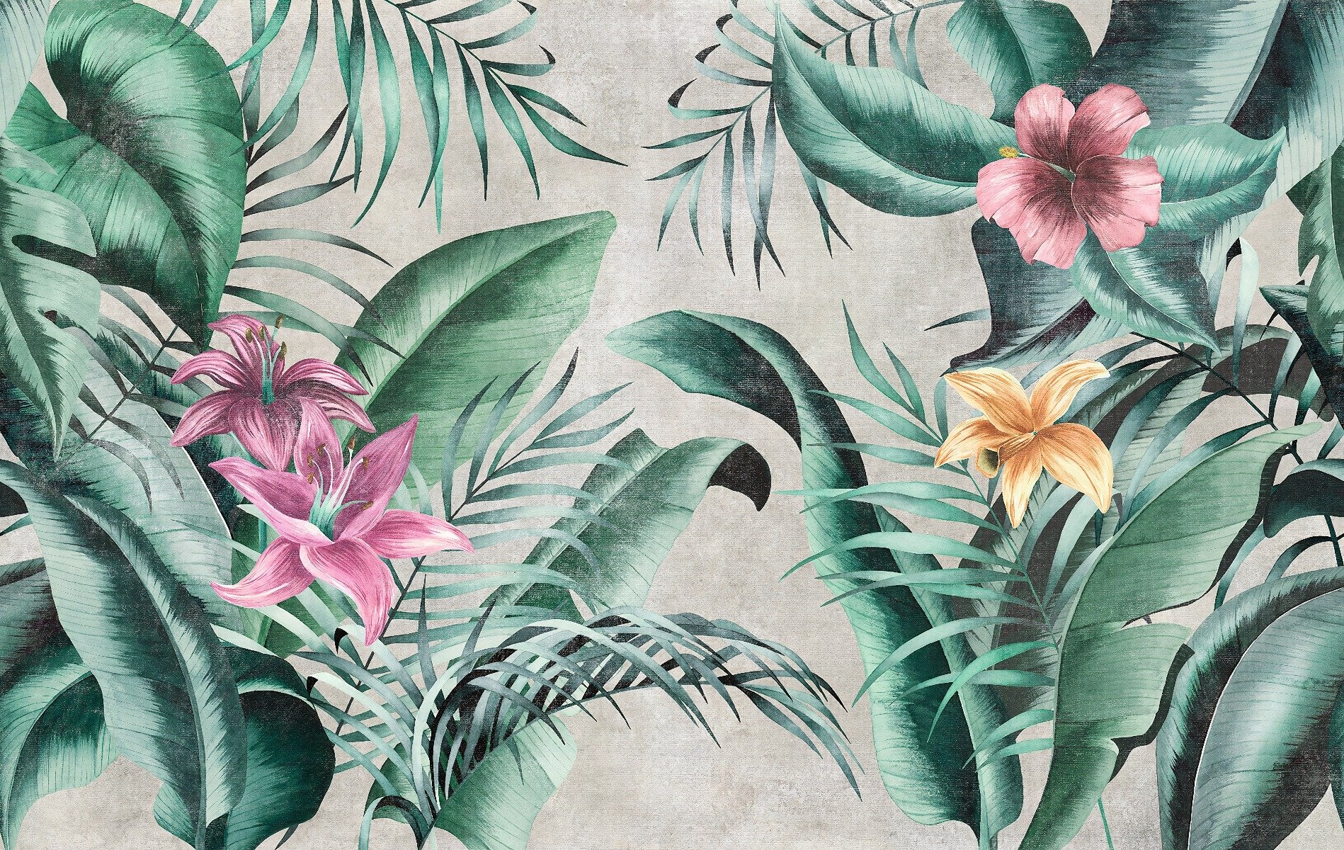 Immerse your interiors in the vintage charm of our rustic floral large green leaves wallpaper mural.  Mural. This exquisitely designed wall covering breathes life into any room, with its unevenly highlighted colors that add a touch of drama to both modern and heritage spaces. Sophisticated yet laid-back, the intricate flowers and sprawling leaves set a backdrop that is equally stunning behind contemporary furnishings or paired with antique treasures.