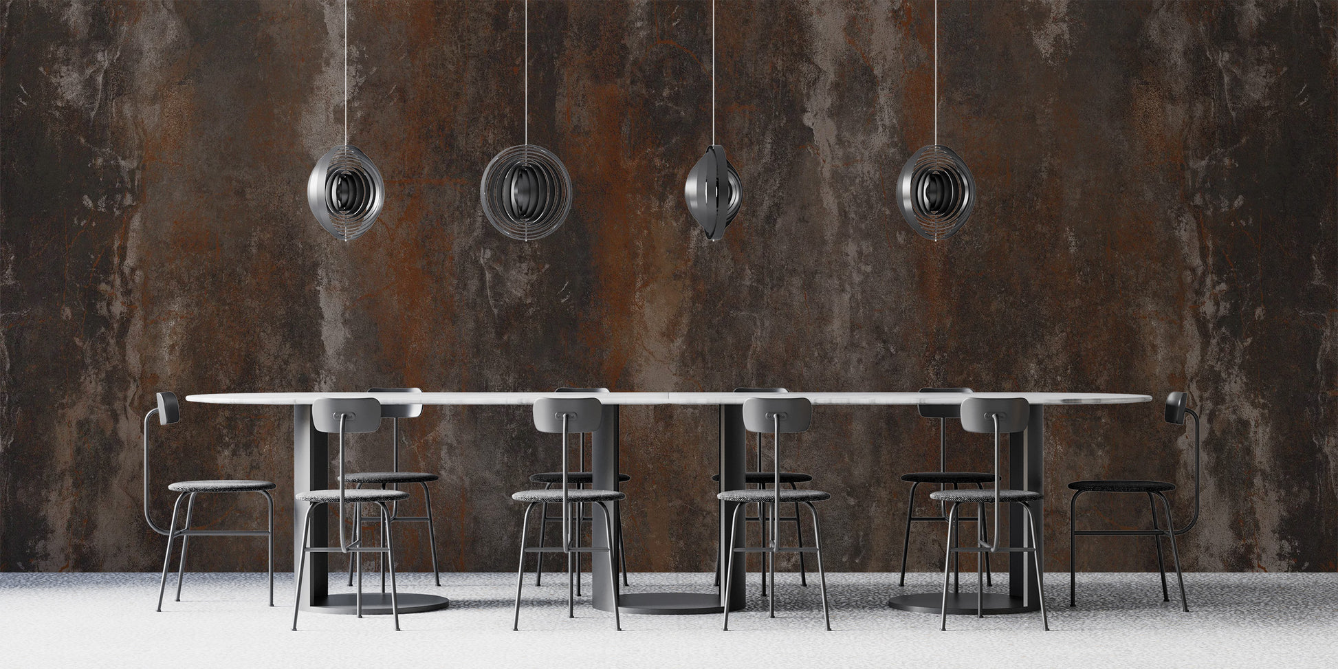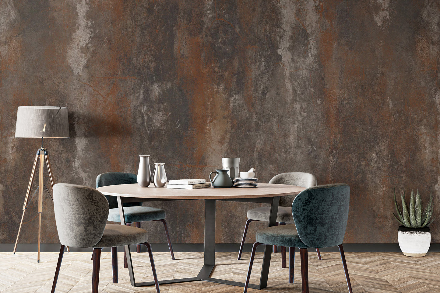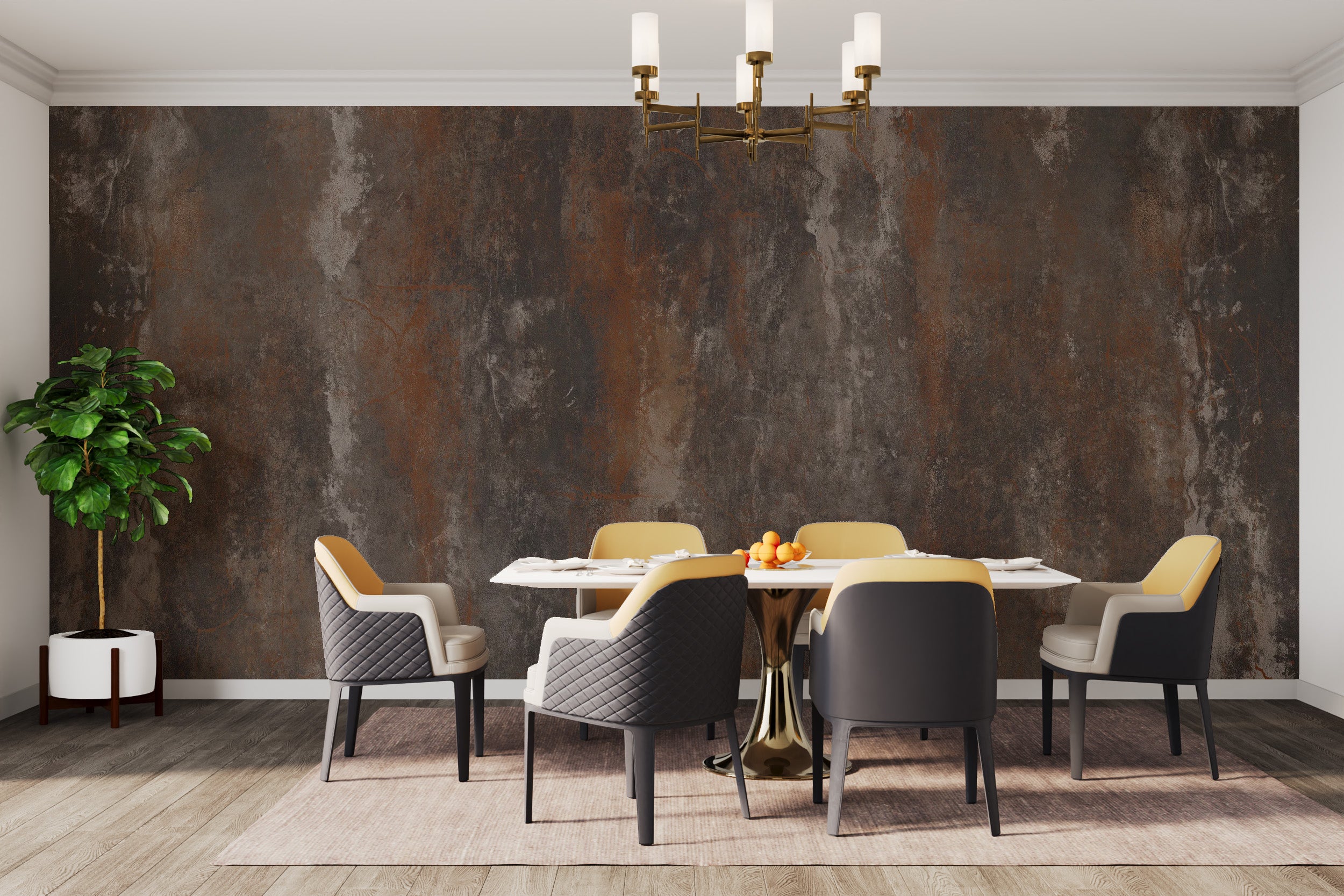 Rustic Metal Texture wallpaper sets the tone in dining rooms