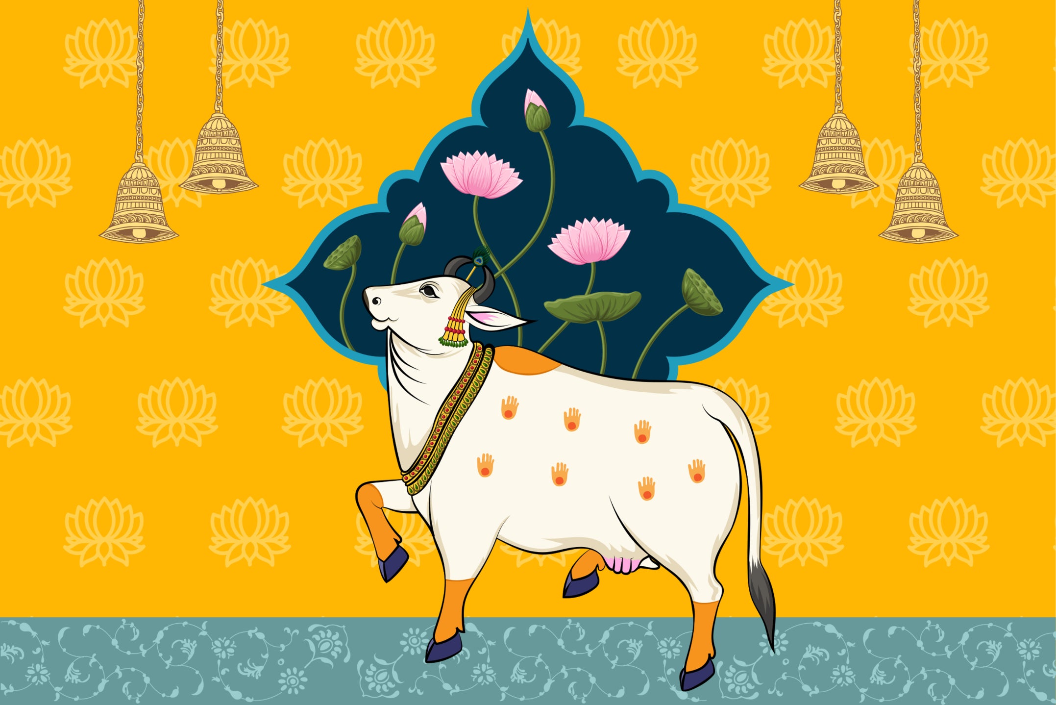 Bring divine energy into your space with the sacred cow Hindu worship mural, inspired by traditional Indian religious art. Featuring a revered cow with symbolic handprints, lotus flowers, and temple bells, this design reflects spirituality and cultural heritage. The vibrant gold, teal, and orange hues highlight the Hindu rituals' essence. This Hindu Temple Cow Painting enhances positivity and sacredness, making it ideal for prayer rooms and meditation spaces. The intricate detailing of this Indian religious cow art creates a spiritually uplifting environment. Perfect for those seeking an authentic Kamadhenu Cow Worship experience in their surroundings.