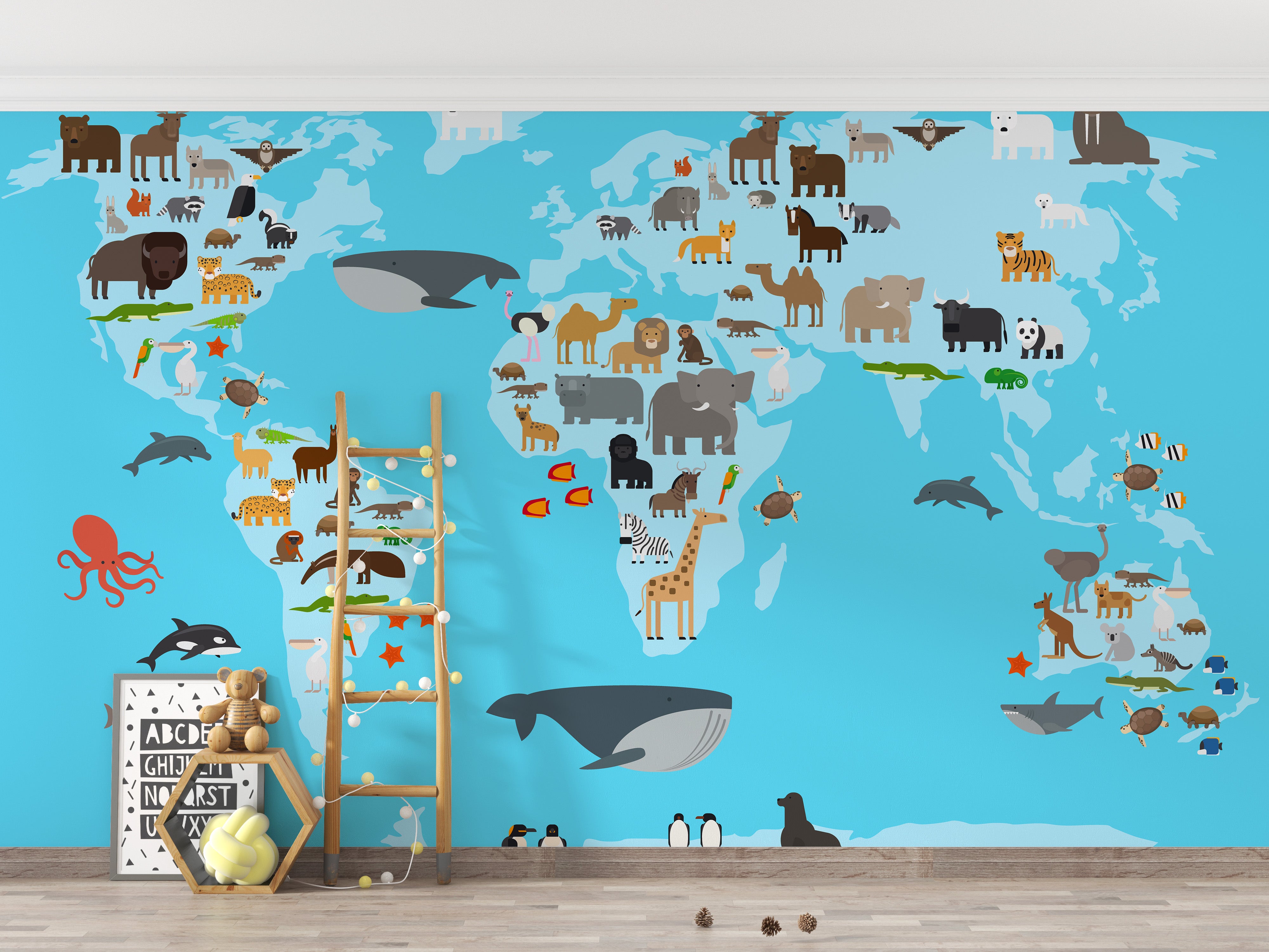 Fun animals map wallpaper mural for kids' bedroom decor.
