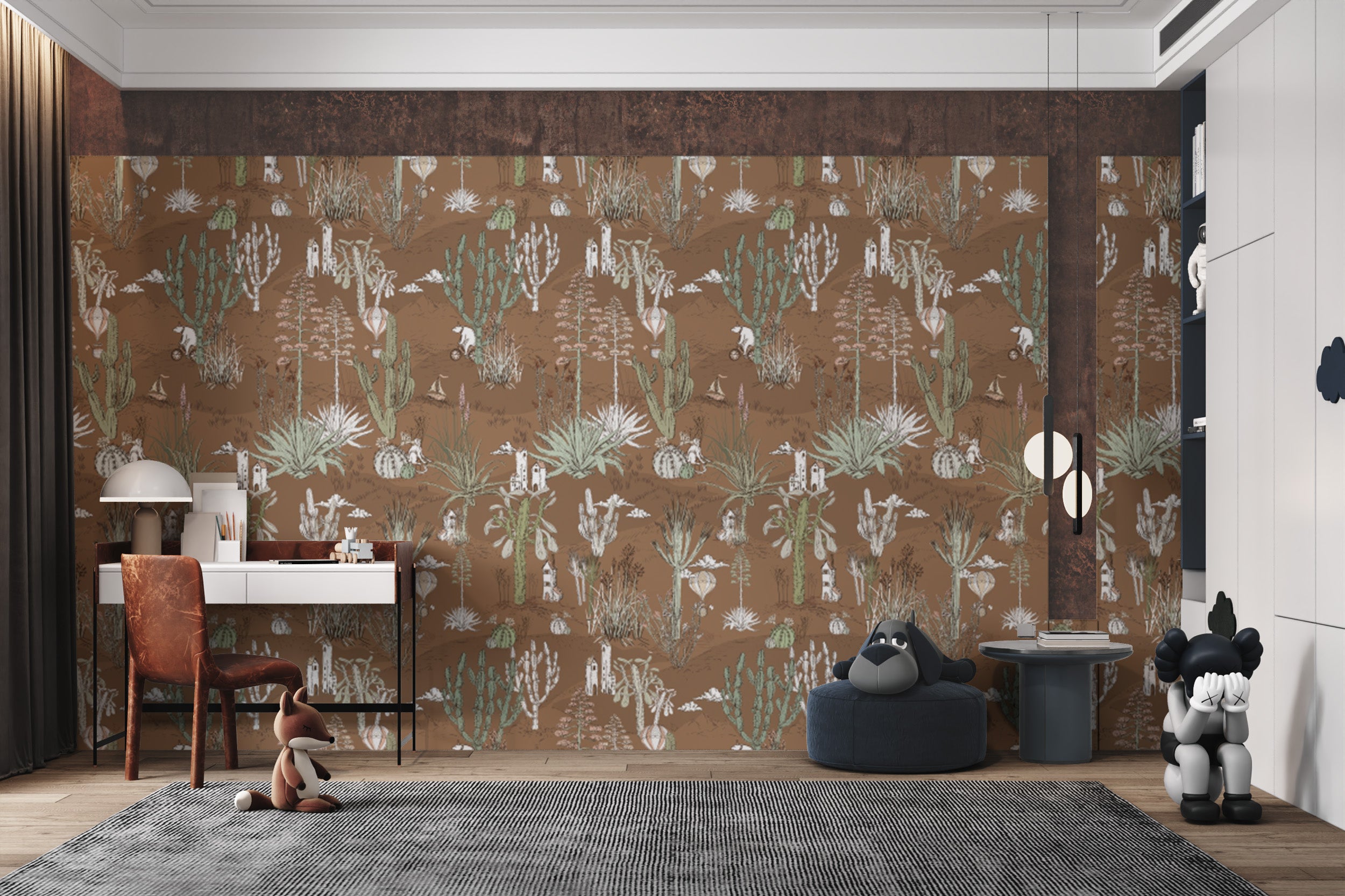 Immerse your living room in the rustic charm of the Southwest with the Saguaro Serenade wallpaper. Envision the grandeur of towering cacti amid a desert oasis, captured in stunning detail and earthy hues that bring warmth and life to your walls. This pattern offers a unique botanical touch, turning any living space into a serene desert landscape. Perfect for those seeking to infuse their home with nature's rugged beauty, this living room wallpaper is a harmonious blend of flora and artistry. Create a striking focal point in your home where conversations blossom and peace resides amidst the serene saguaro silhouettes.