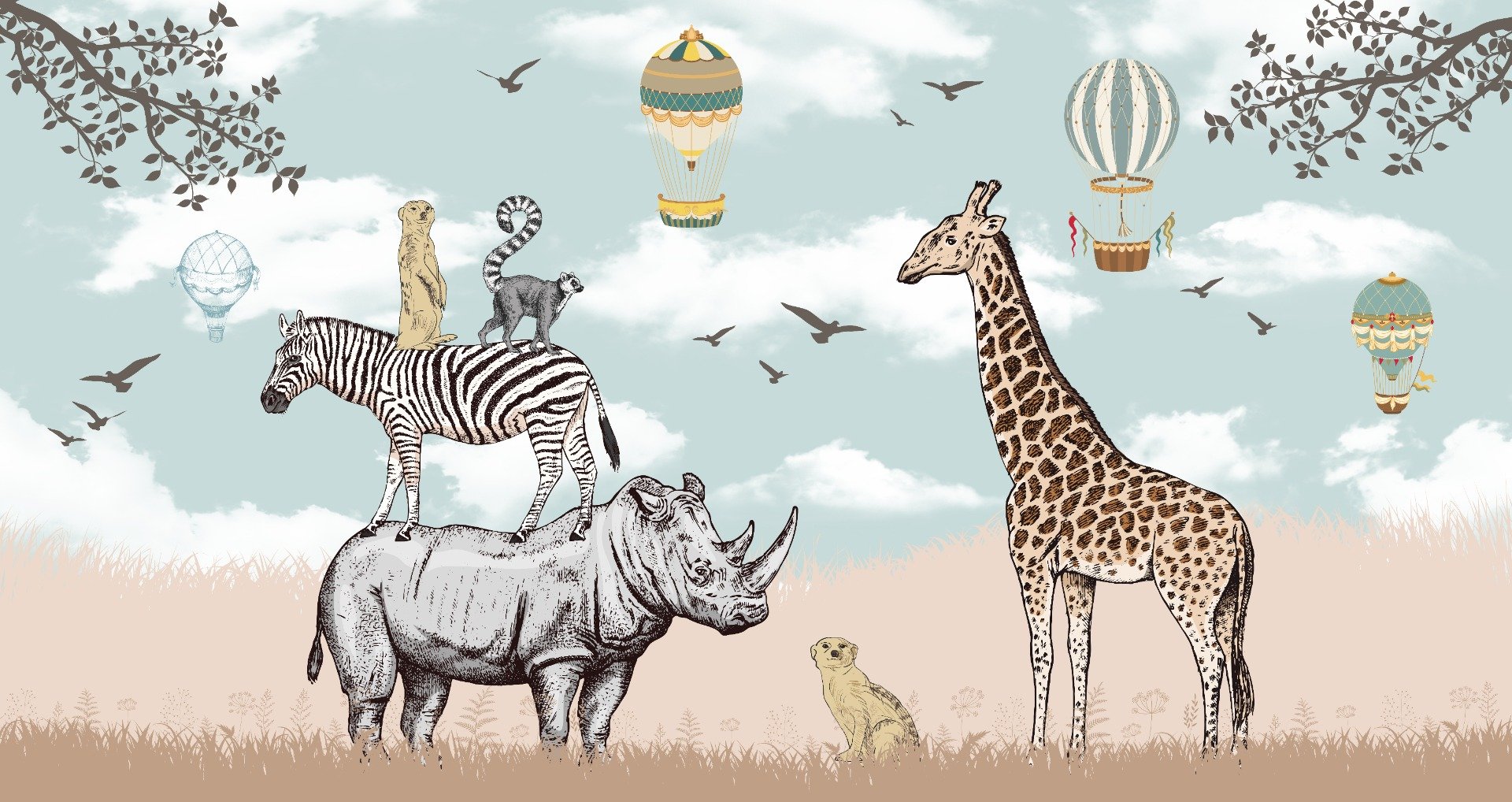 Step into a world of wonder with our savannah animals kids room wallpaper mural, a delightful addition to any child's bedroom. Picture the vast grasslands and expansive blue skies, now within the cozy confines of your home. Each stroke of this animated design brings a piece of Savannah's charm, peppered with playful animals that seem to leap off the walls, igniting your child's imagination. Floating hot air balloon motifs add a whimsical touch, creating a scene from a fairytale. This savannah animals wallpaper mural isn't just about aesthetics; it's an adventure, a story unfolding on your walls. Pair it with soft, pastel furnishings to create a serene yet stimulating environment, a perfect backdrop for your little one's dreams and daydreams.