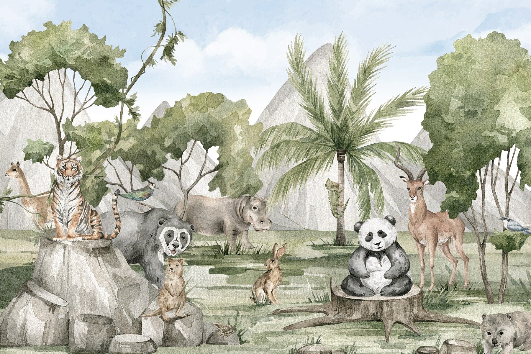 The Savannah Summit wildlife mural is an exquisite canvas that captures the vibrant essence of the jungle. This animal wallpaper is a rich depiction of wildlife coexisting in their natural habitat, with each creature rendered in exquisite detail against a backdrop of lush greenery As a piece of jungle wallpaper, it invites the wild into your home, offering a window to the serene life of the savannah. The greens and earthy tones of the mural create a sense of life and growth, making it a perfect green wallpaper for any room looking to add a touch of nature's vitality. Designed to inspire and captivate, the Savannah Summit Wildlife Mural serves as a daily reminder of the world's natural wonders, celebrating the diversity of animals that roam the expansive plains of the savannah. It's a panoramic tribute to the beauty of the wild, inviting viewers to lose themselves in the grandeur of the animal kingdom.