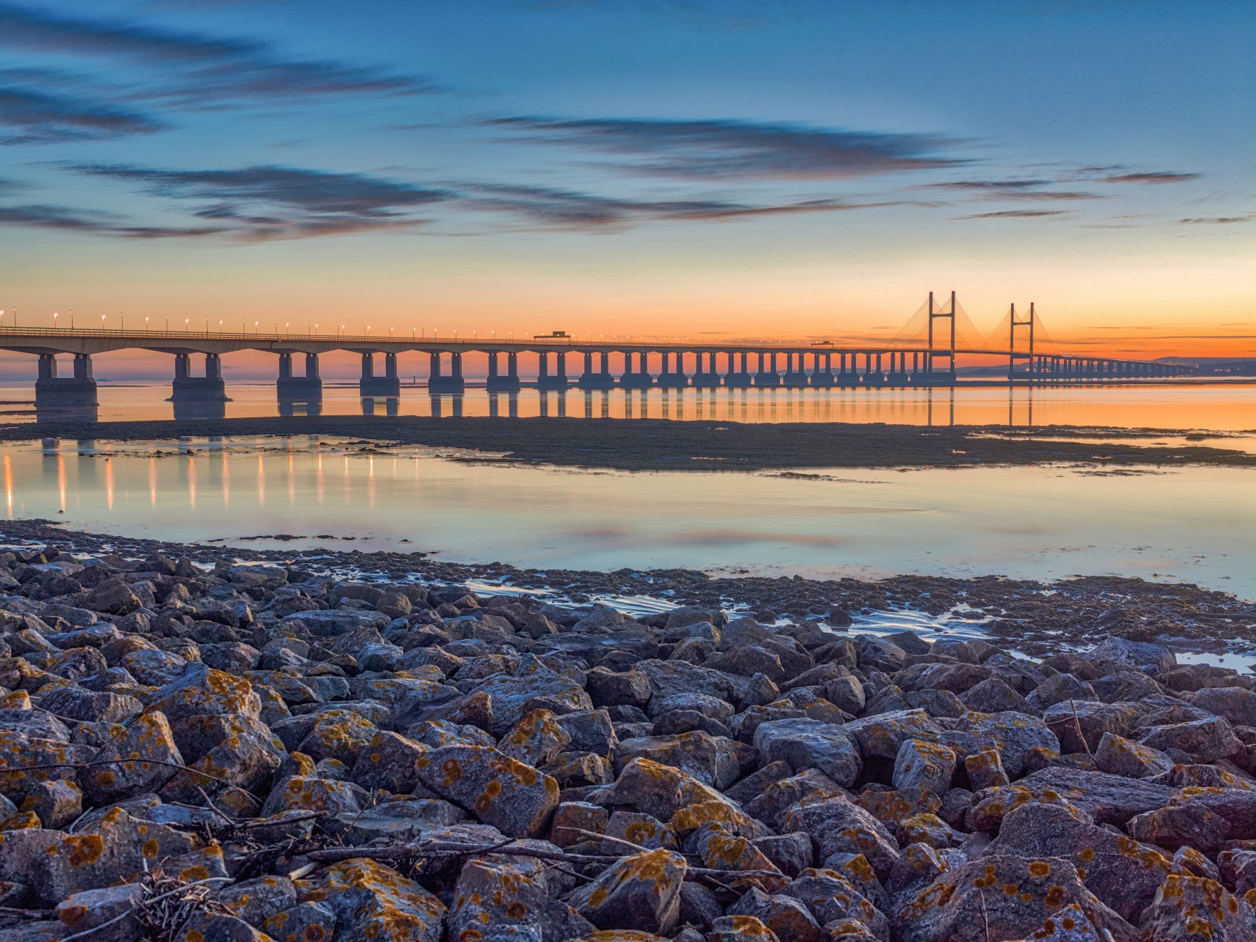 Severn Bridge at Dusk, Wales, UK. Immerse yourself in the serene beauty of this 'Scenic River Bridge View' wallpaper. A breathtaking panorama unfolds as a majestic bridge stretches across a tranquil river, illuminated by the soft, warm hues of the setting sun. The sky transforms into a canvas of blues, oranges, and pinks, mirrored perfectly in the calm waters below. The bridge, adorned with delicate lights, creates a captivating silhouette against the vibrant sky. In the foreground, rocky terrain adds a touch of ruggedness to the scene, providing a grounded perspective to the expansive view. This wallpaper captures a moment of peaceful harmony, blending natural beauty with architectural wonder. A perfect backdrop to inspire calm and reflection, it's an ideal choice for adding a touch of scenic elegance to your digital space.