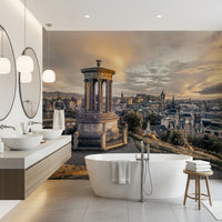 Invite the timeless beauty of Edinburgh into your home with this stunning wallpaper for walls. The design captures the city's skyline under a dramatic sky, offering a blend of architectural detail and natural light. Its dominant color tones are beige, gray, and golden hues, creating a calm, yet striking aesthetic. This mural enhances bedrooms, living rooms, and dining spaces with its blend of classic and sophisticated style. The detailed panorama enriches interior spaces, evoking a sense of wonder and historical depth. Transform any room into a captivating space with this scenic cityscape.
