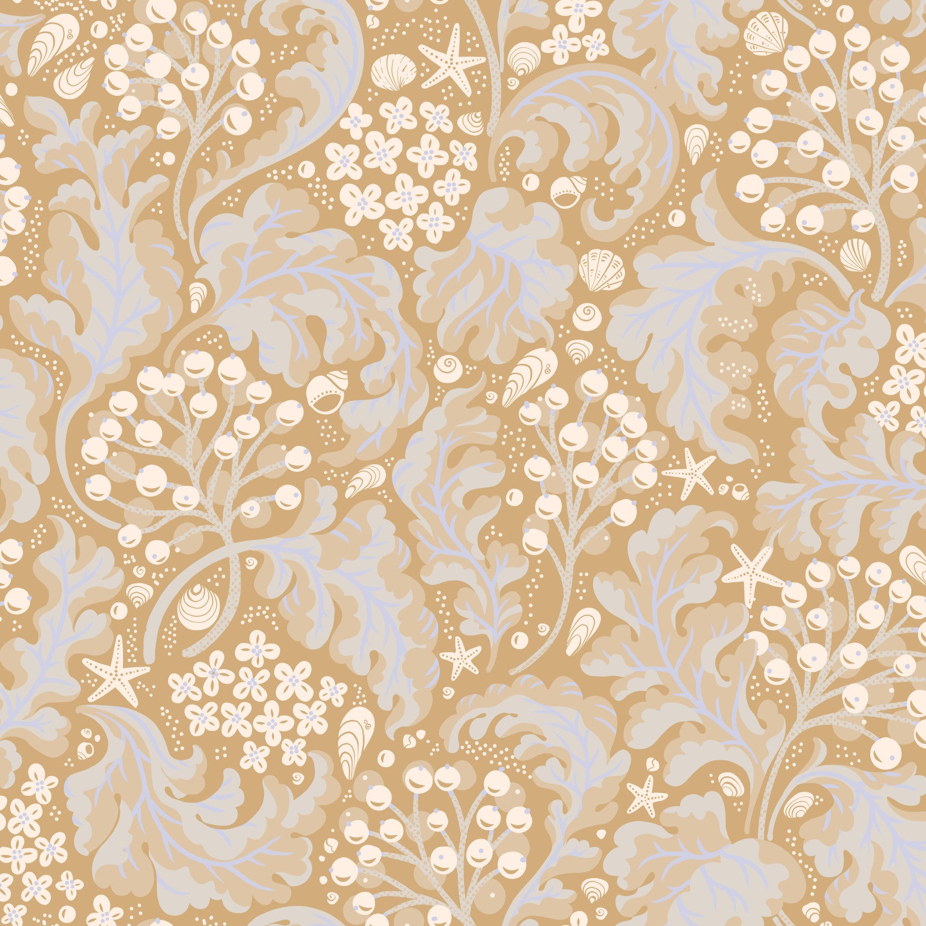 Immerse yourself in the tranquil beauty of 'Sea Kale - Ochre Yellow'. This wallpaper evokes a serene coastal atmosphere with its calming ochre yellow backdrop, adorned with delicate sea kale motifs in soft blues and creams. Stylized seashells, starfish, and charming floral elements are artfully interwoven, creating a seamless pattern of organic elegance. Perfect for adding a touch of understated seaside sophistication to any digital device, this wallpaper offers a peaceful escape to the coast, without ever leaving your screen.