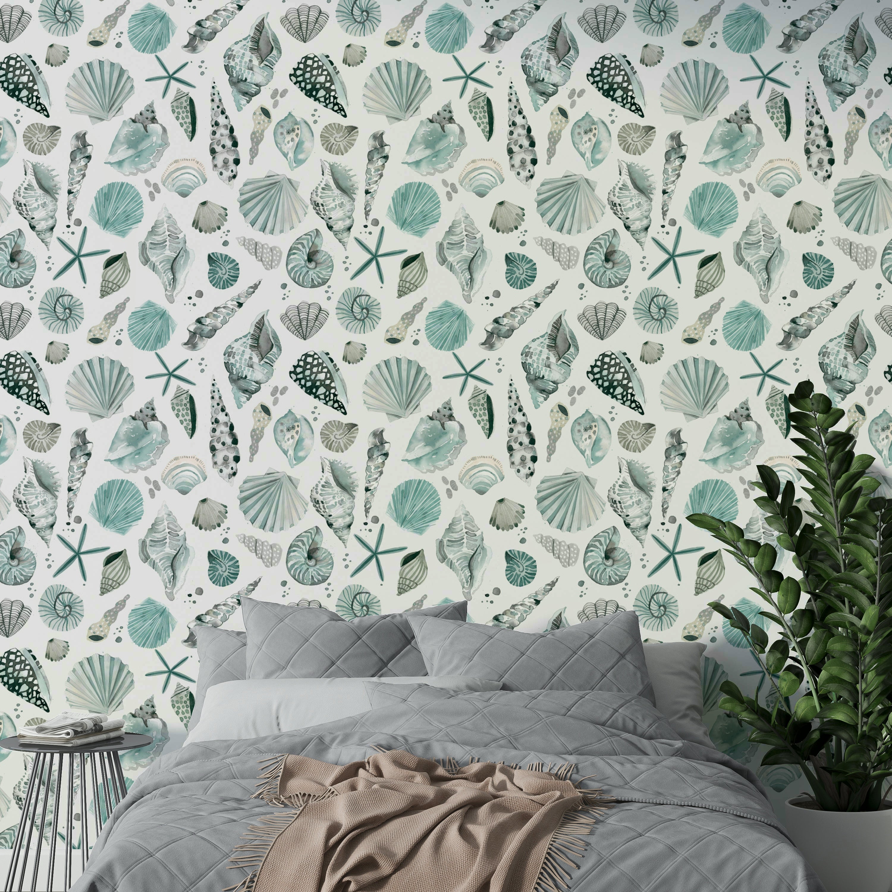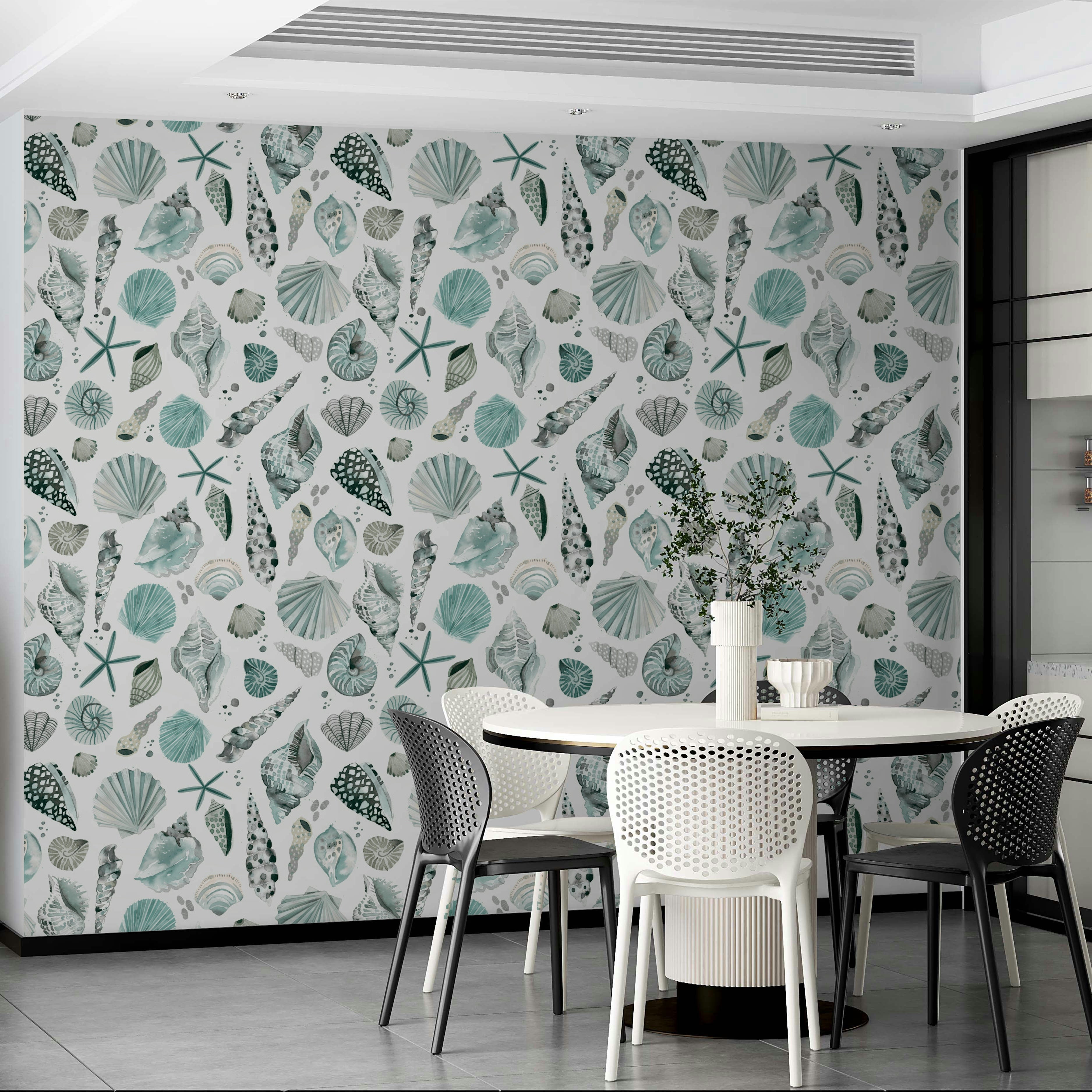 Wallpaper with ocean-inspired shell designs in breezy tones.