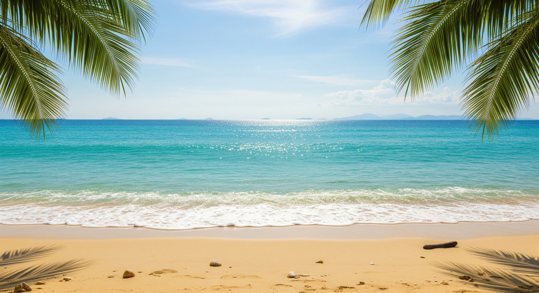 Bring the beach to your home with this seaside wallpaper. This design presents a beautiful scene of a tropical beach with palm trees framing a clear blue ocean. The warm sandy beach creates a comforting contrast to the cool water. Use this wallpaper for walls to transform any room into a relaxing getaway, fitting well in living rooms, bedrooms, or even a home office. The design enhances interiors with its bright colors and peaceful vibe, making every space feel like a vacation.