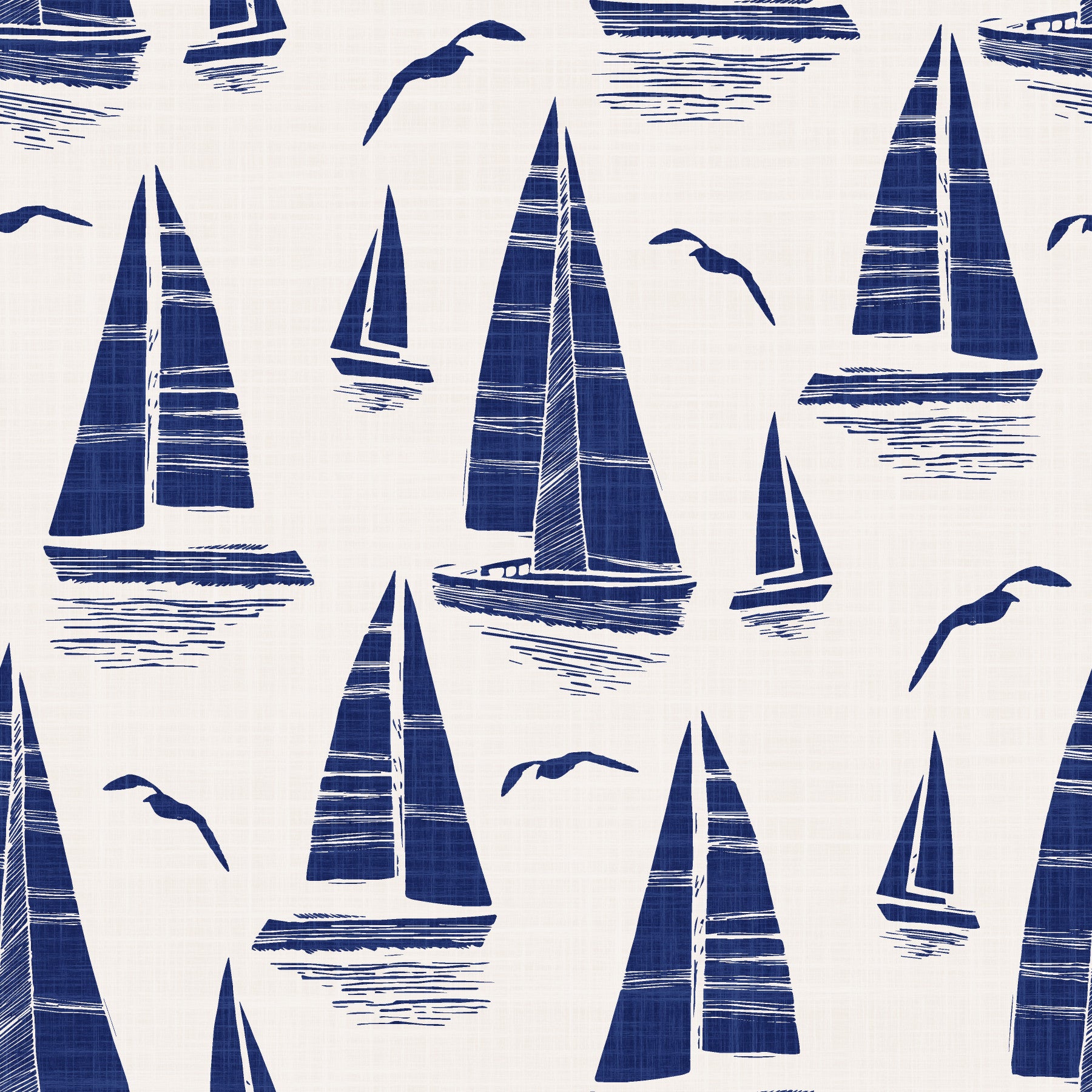 Stylized navy blue sailboats, rendered with a textured, linen-like effect, glide across a soft off-white background, evoking a sense of calm and nautical charm. Seagulls in flight add a dynamic touch, completing the scene with a feeling of freedom and coastal adventure. The repeating pattern is perfect for bringing a refreshing maritime ambiance to any space, from bedrooms to living rooms, infusing a touch of elegant simplicity and seaside serenity.