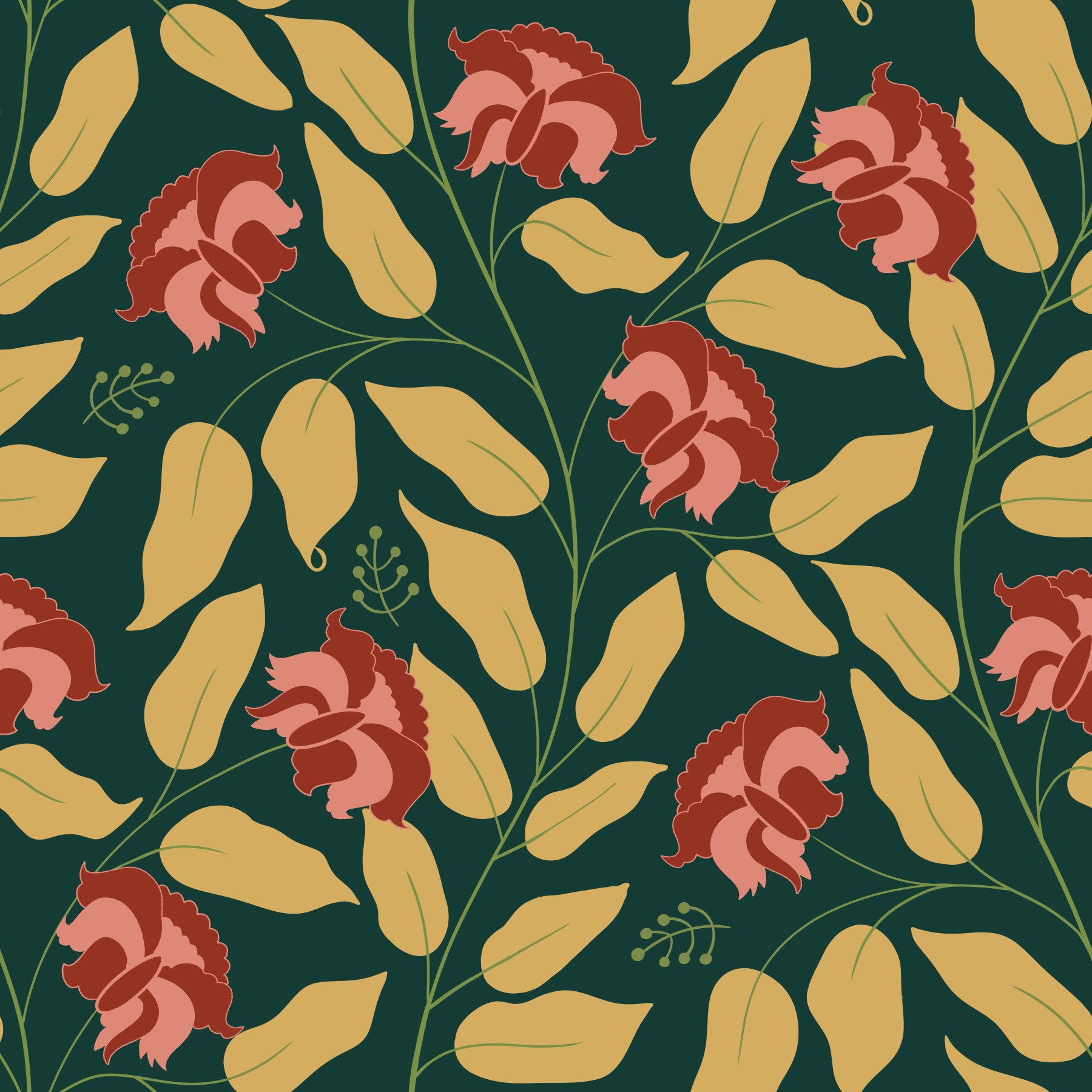 Immerse yourself in the enchanting embrace of Seraphyne - Floral Forest Delight a wallpaper that brings a touch of whimsical elegance to your digital space. This captivating design features stylized blossoms in warm terracotta and delicate blush hues, artfully juxtaposed against a verdant, deep forest green backdrop. Golden-toned leaves unfurl around the blooms, creating a sense of lush abundance and hidden beauty. The overall effect is a harmonious blend of vibrant color and serene tranquility, evoking the feeling of discovering a secret garden bathed in soft, dappled light. 'Seraphyne' is perfect for creating a calming yet sophisticated atmosphere. Its unique color palette and stylized botanical elements offer a modern twist on classic floral designs, making it an ideal choice for those seeking a wallpaper that is both timeless and contemporary. Let 'Seraphyne - Floral Forest Delight' transform your screen into a haven of natural beauty and artistic expression.