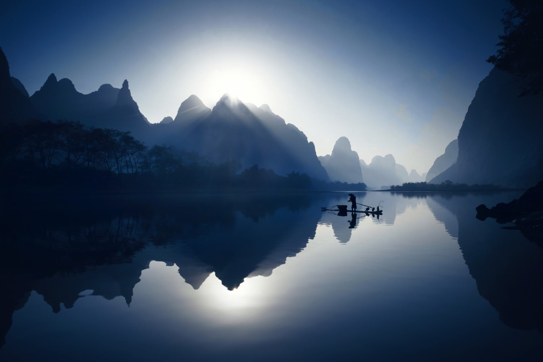 Capture a quiet moment with this striking river scene. Gentle light breaks through the mountain peaks, casting a peaceful mood. The still water shows mirror-like reflections, enhancing the calm. Soft, cool blue dominates, bringing a sense of serenity to any space. Use this wallpaper for walls in your bedroom for a tranquil atmosphere. It also works wonders in a living room or office, lending elegance and a calming presence that complements minimalist or nature-inspired interiors.