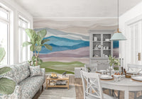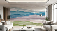This captivating wallpaper for walls transforms any room into a tranquil retreat. It features an abstract landscape design, where soft, flowing layers mimic rolling hills and distant mountain ranges. The watercolor style creates a gentle, ethereal quality with organic, fluid lines, offering a peaceful vista. A harmonious color palette blends serene blues and dusky purples with calming sage greens and warm beige tones. This blend creates inviting visual depth, evoking a sense of calm. Install this unique design in a living room, bedroom, or home office to cultivate a relaxed atmosphere. It beautifully complements modern, minimalist, or bohemian interiors, providing a sophisticated backdrop that enhances your personal sanctuary. The subtle artistry adds elegance without overwhelming the space.