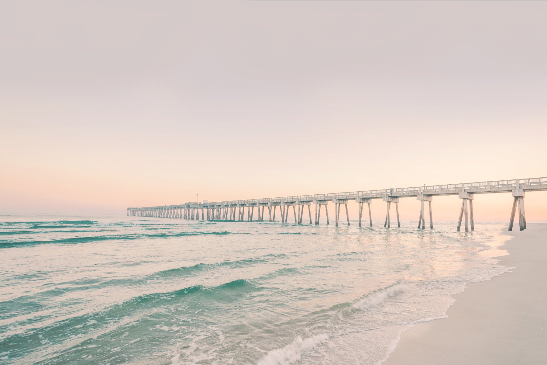 A minimalist seascape wallpaper featuring a long pier extending into a tranquil ocean at sunset. Soft, pastel hues of pink and teal dominate the image, creating a calming and peaceful atmosphere. Gentle waves lap the shore, adding a sense of serenity and tranquility. The minimalist composition and muted colors make it ideal for creating a relaxing and peaceful ambiance in any space. The image evokes feelings of calm, peace, and escape, transporting viewers to a serene coastal paradise.