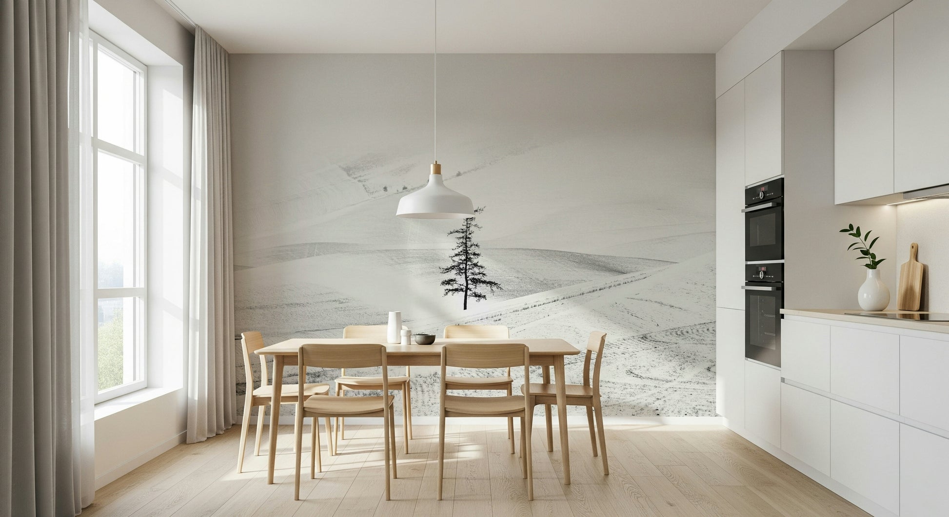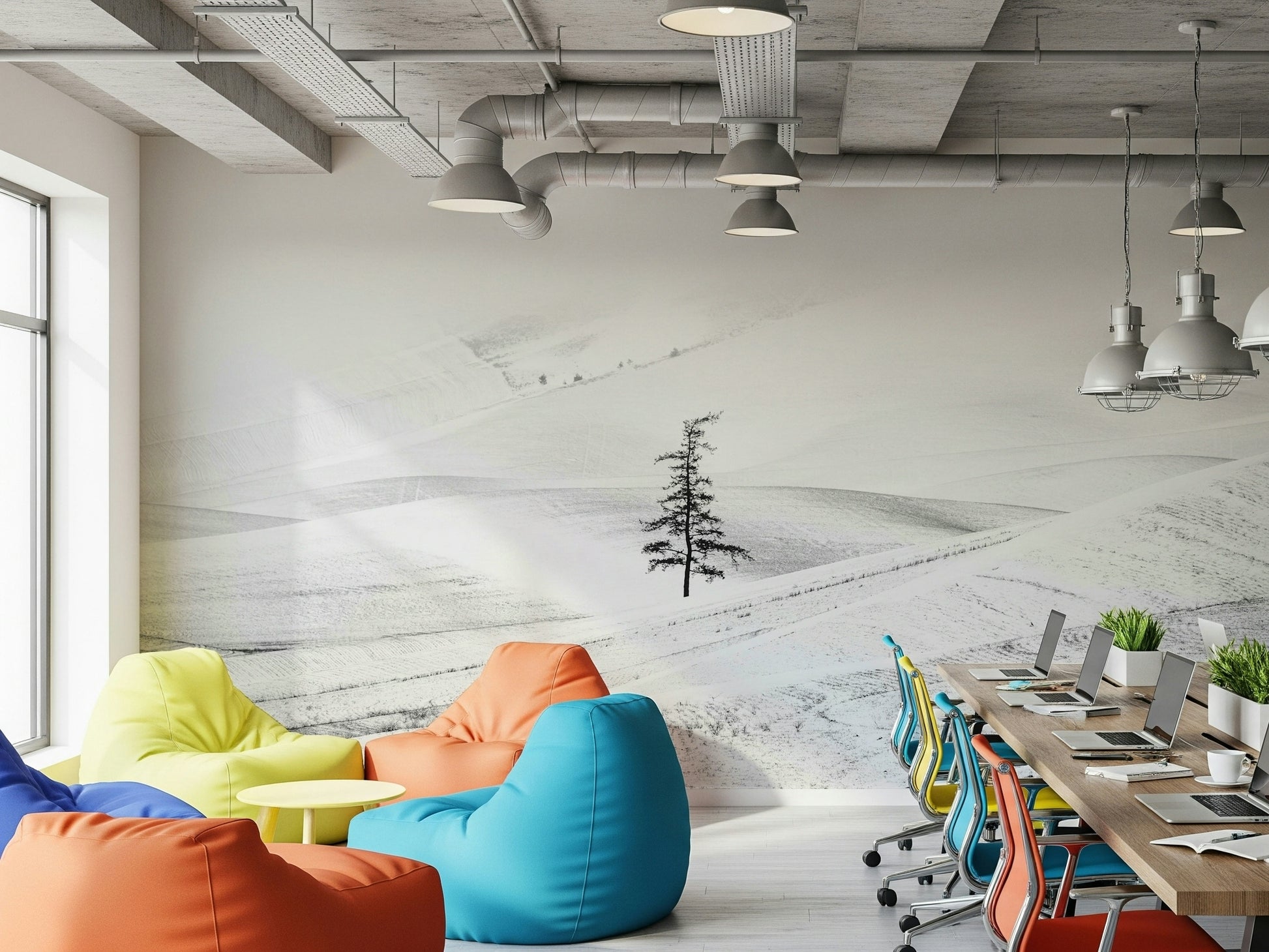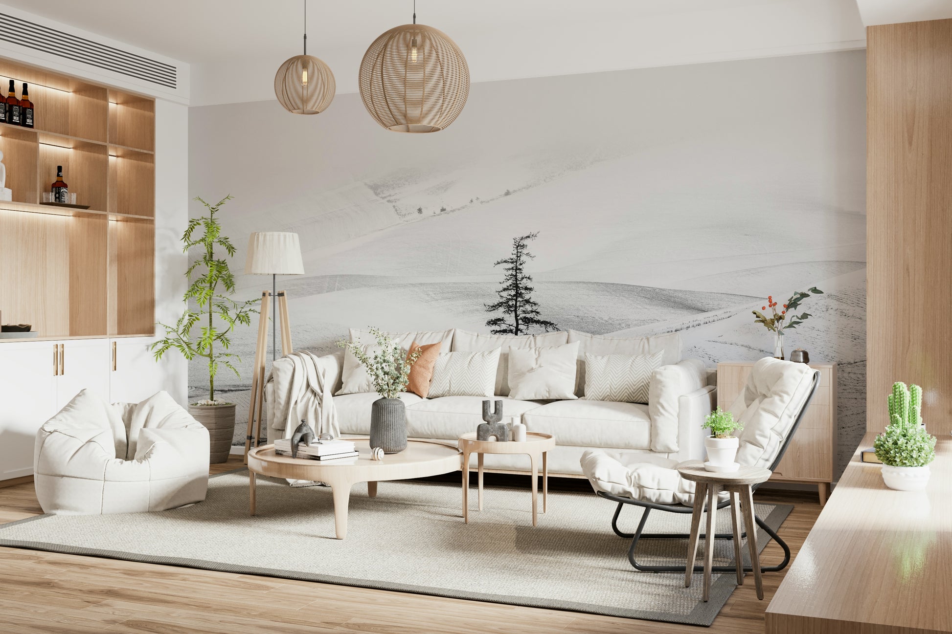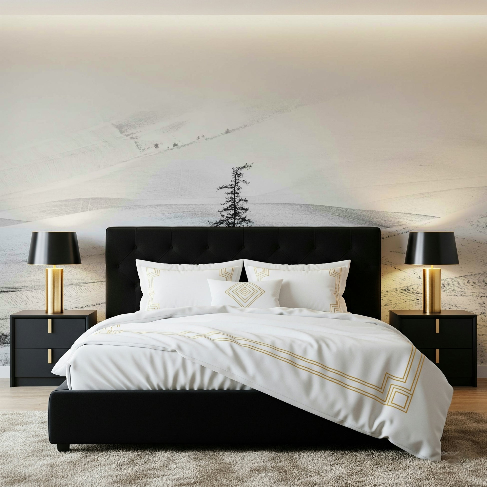 Transform your space with this calming landscape, turning your room into a serene escape. A solitary tree graces snow-covered hills, producing an artistic mood. The monochrome palette adds depth to any bedroom or living room. This wallpaper for walls can fit seamlessly into modern, minimalist, and elegant decors. Its subtle patterns offer a unique focal point.