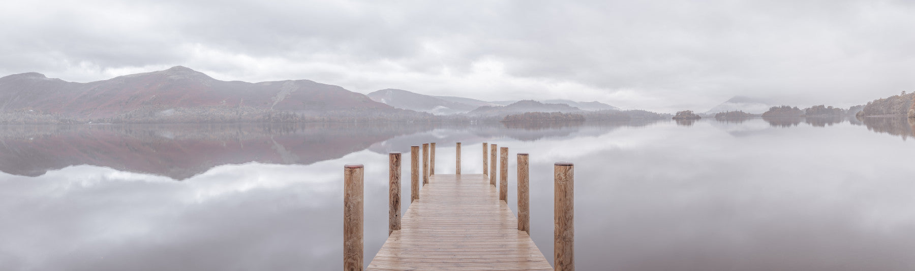Wooden pier on the lake. Bring a peaceful touch to your home with this scenic landscape. Soft colors and a still lake create a calming mood. Wood posts lead the eye to distant hills, mirroring in the tranquil water. The muted palette makes this wallpaper for walls ideal for bedrooms, living rooms, or any space where relaxation is key. The subtle design of this wallpaper for walls complements minimalist interiors, adding depth without overwhelming the room.