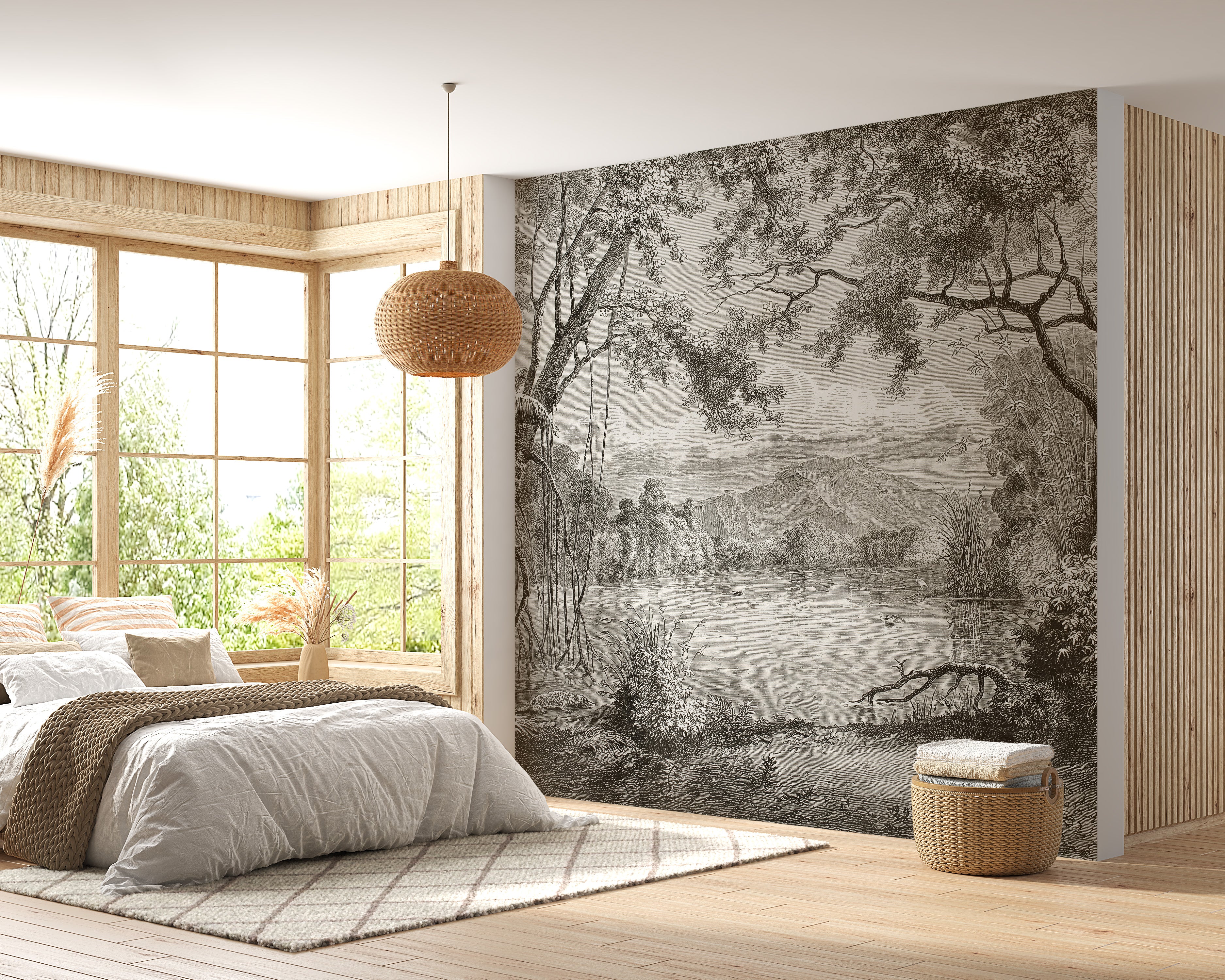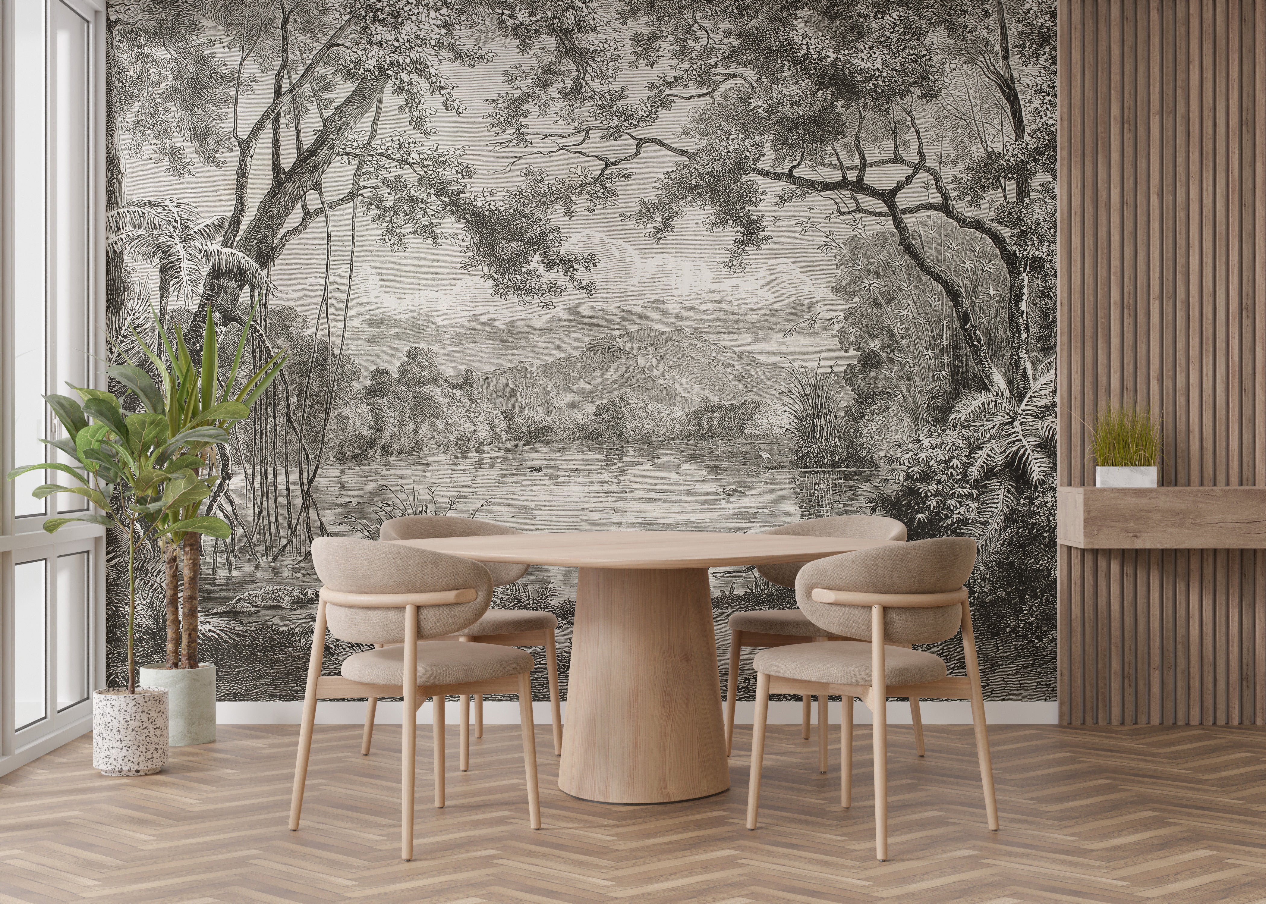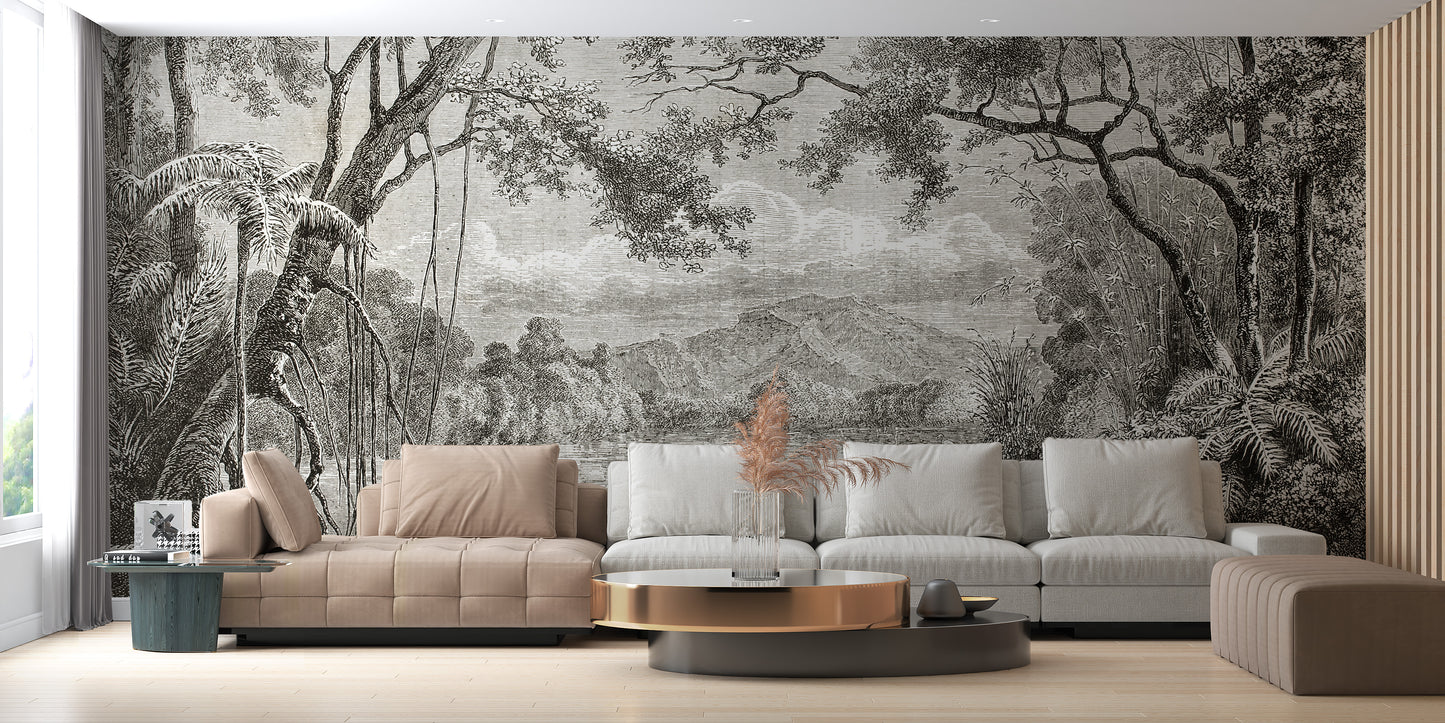 Transform your living space into an enchanting Eastern sanctuary with our Sketchy Hills Wallpaper Murals. Immerse yourself in a serene riverside landscape, meticulously sketched to capture the timeless beauty of Asiatic jungles shrouded in mist. The dusky hues of the sky, hills, and lake shore blend harmoniously to evoke the allure of an early forest's mystic ambiance. This peel-and-stick wallpaper is the epitome of aesthetic elegance, perfect for complementing bedrooms and living rooms with its painterly appeal. Infuse your home decor with vibrant colors to create a stunning contrast against this mural's inked forest backdrop. Whether gracing your office or personalizing your nursery area, the Sketchy Hills Wallpaper Murals promise to be a captivating focal point in any room.