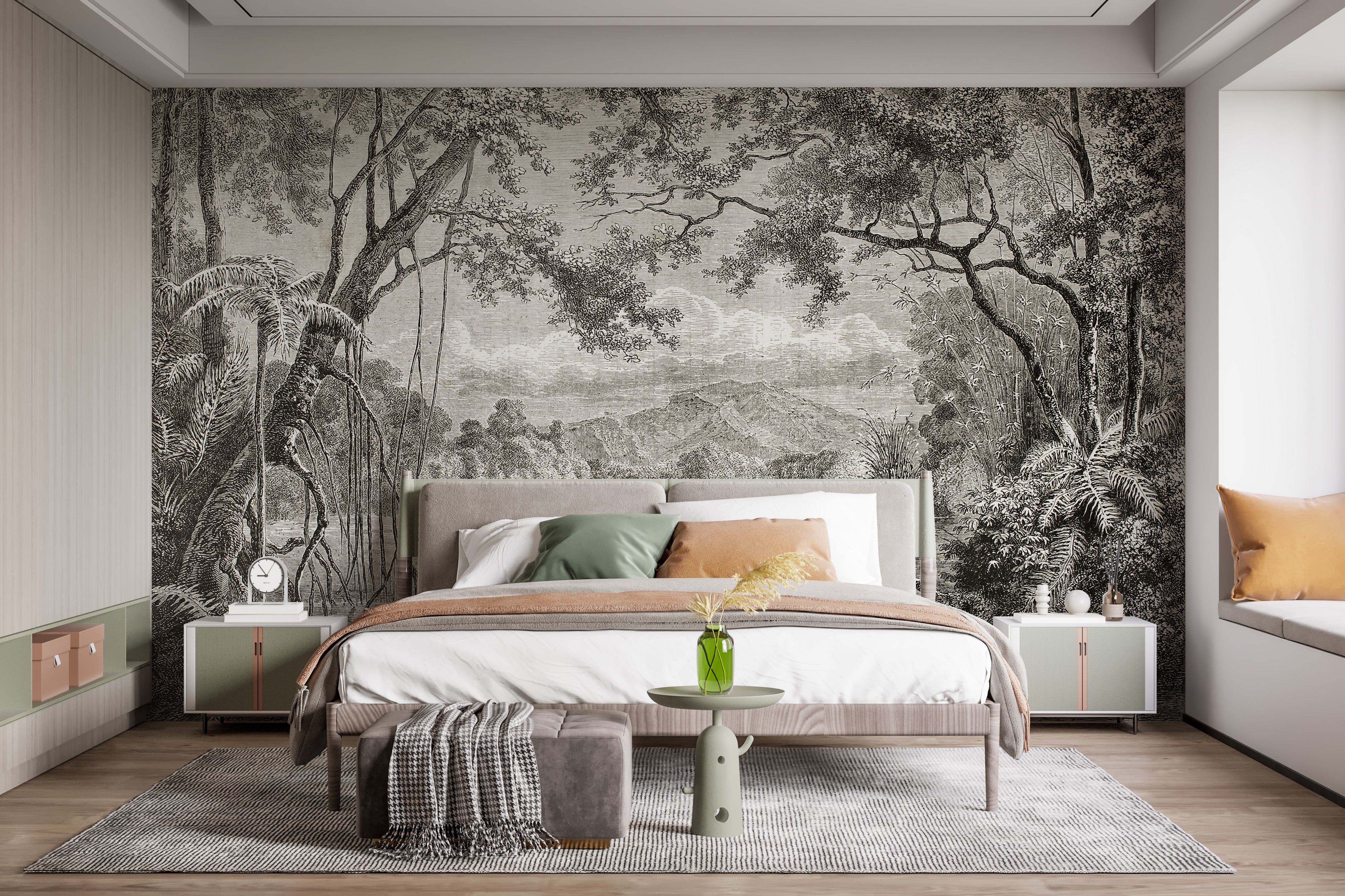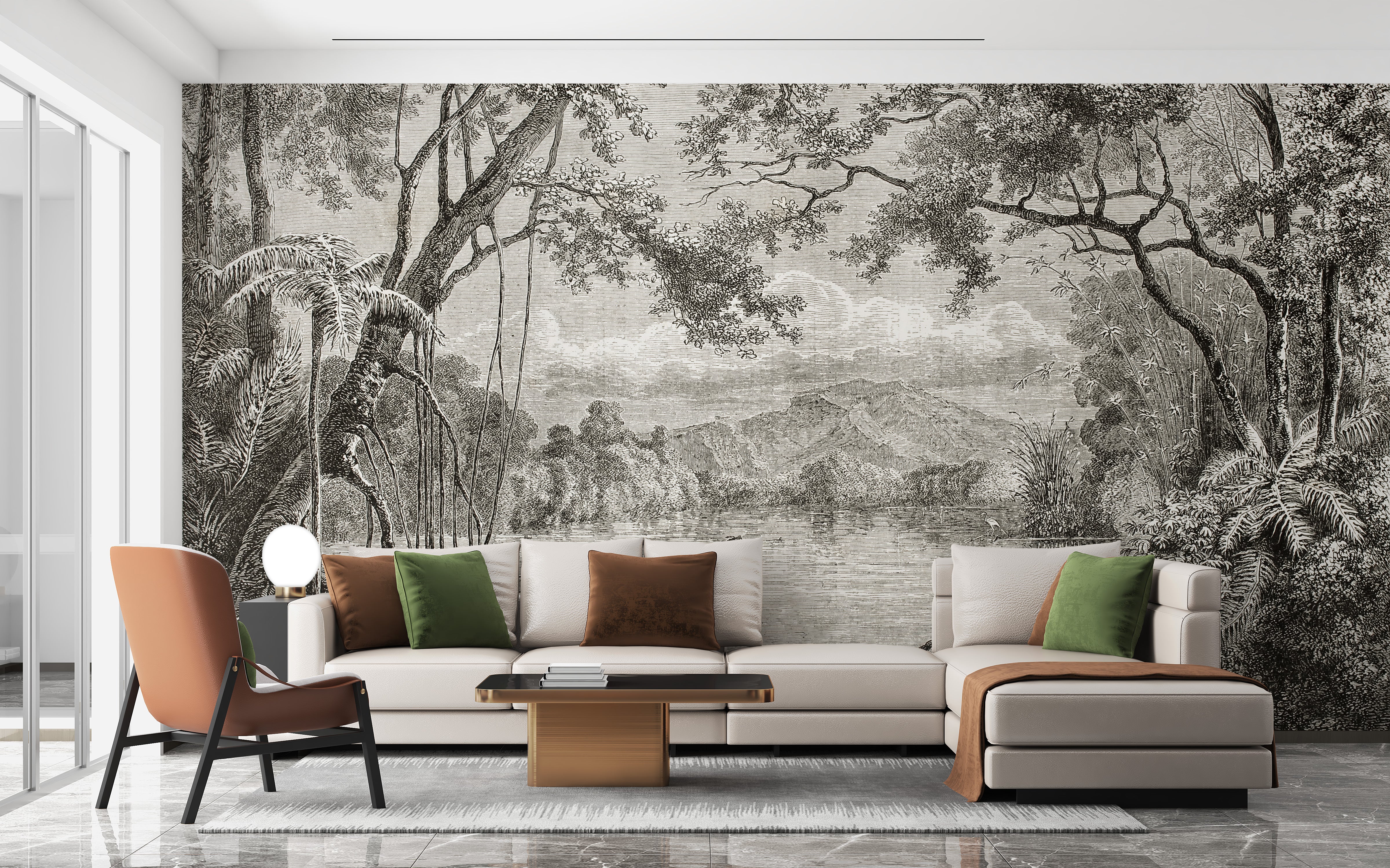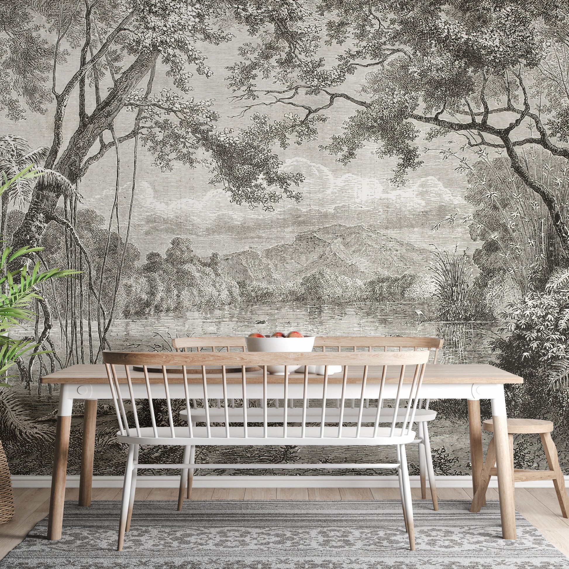 Transform your living space into an enchanting Eastern sanctuary with our Sketchy Hills Wallpaper Murals. Immerse yourself in a serene riverside landscape, meticulously sketched to capture the timeless beauty of Asiatic jungles shrouded in mist. The dusky hues of the sky, hills, and lake shore blend harmoniously to evoke the allure of an early forest's mystic ambiance. This peel-and-stick wallpaper is the epitome of aesthetic elegance, perfect for complementing bedrooms and living rooms with its painterly appeal. Infuse your home decor with vibrant colors to create a stunning contrast against this mural's inked forest backdrop. Whether gracing your office or personalizing your nursery area, the Sketchy Hills Wallpaper Murals promise to be a captivating focal point in any room.
