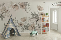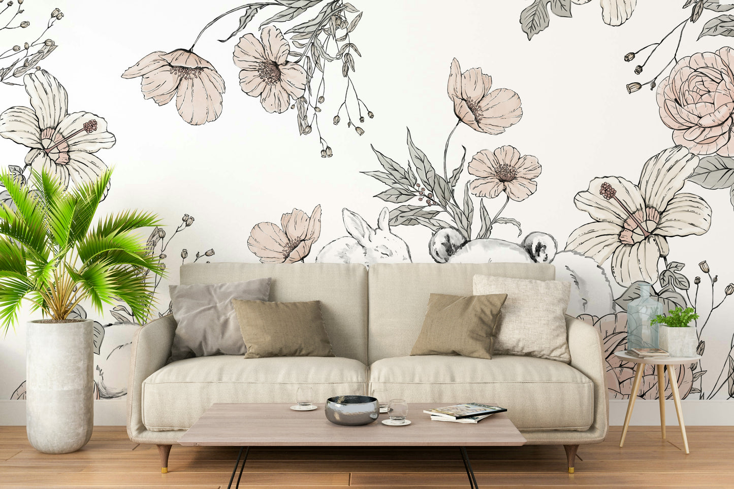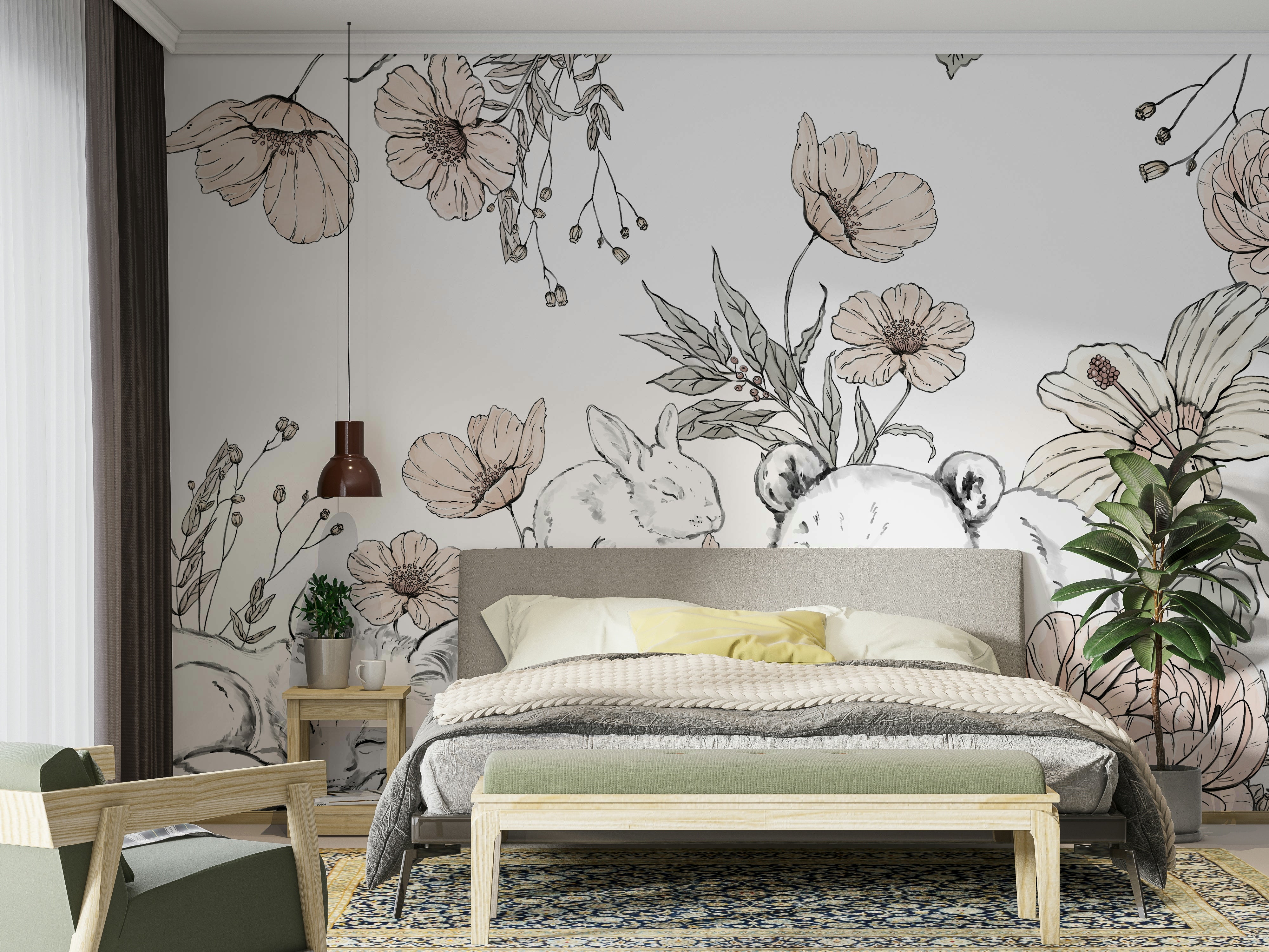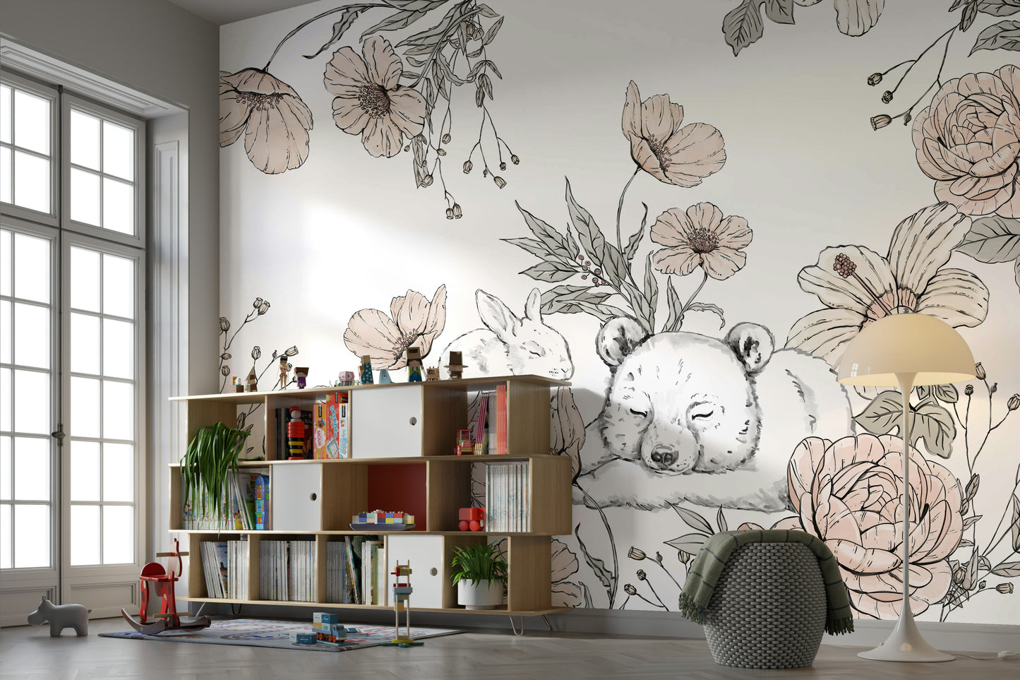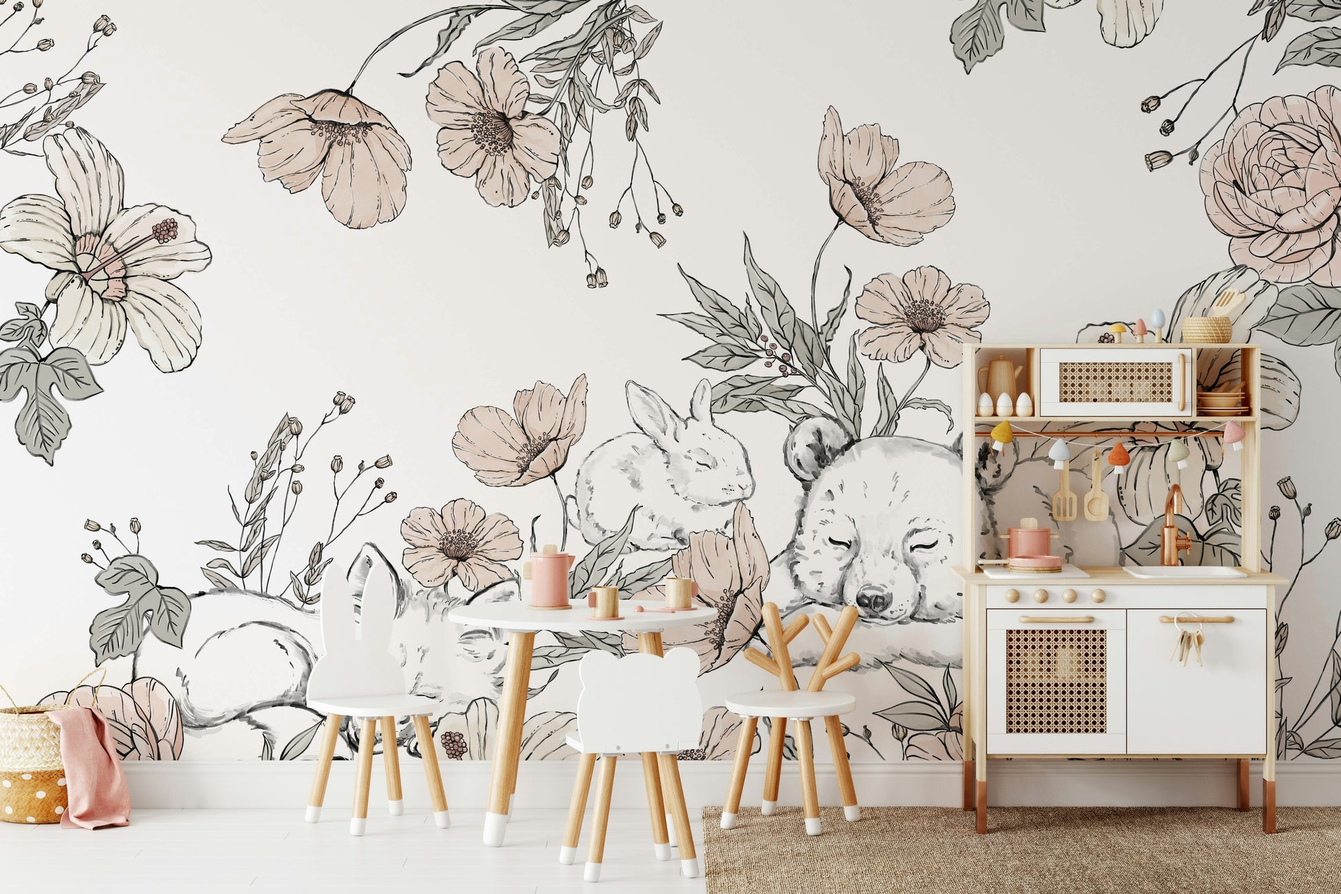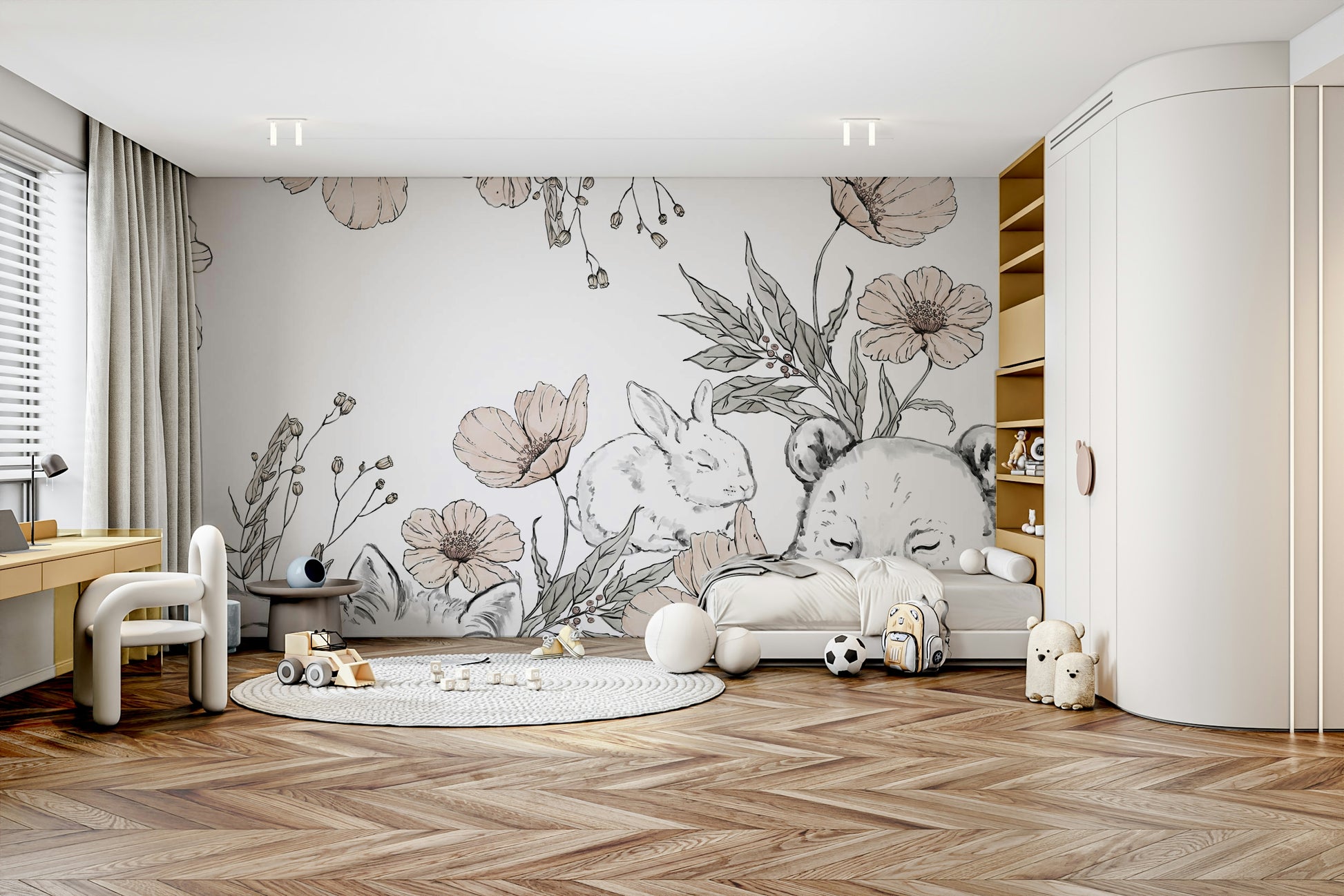 Drift into a world of peace and whimsy with the Sleeping Woodland Mural Wallpaper by designer Ewa Brzozowska for Giffywalls. This enchanting mural showcases a fox, bunny, and bear peacefully asleep among delicate hand-drawn florals and leaves, brought to life in a soothing neutral palette. Ewa’s signature soft, storybook style makes this mural ideal for nurseries, playrooms, or any space in need of a calming touch. Thoughtfully illustrated and rich in charm, it invites serenity while sparking the imagination. Let this mural wrap your walls in the gentle hush of the forest, where every nap feels like a fairy tale.
