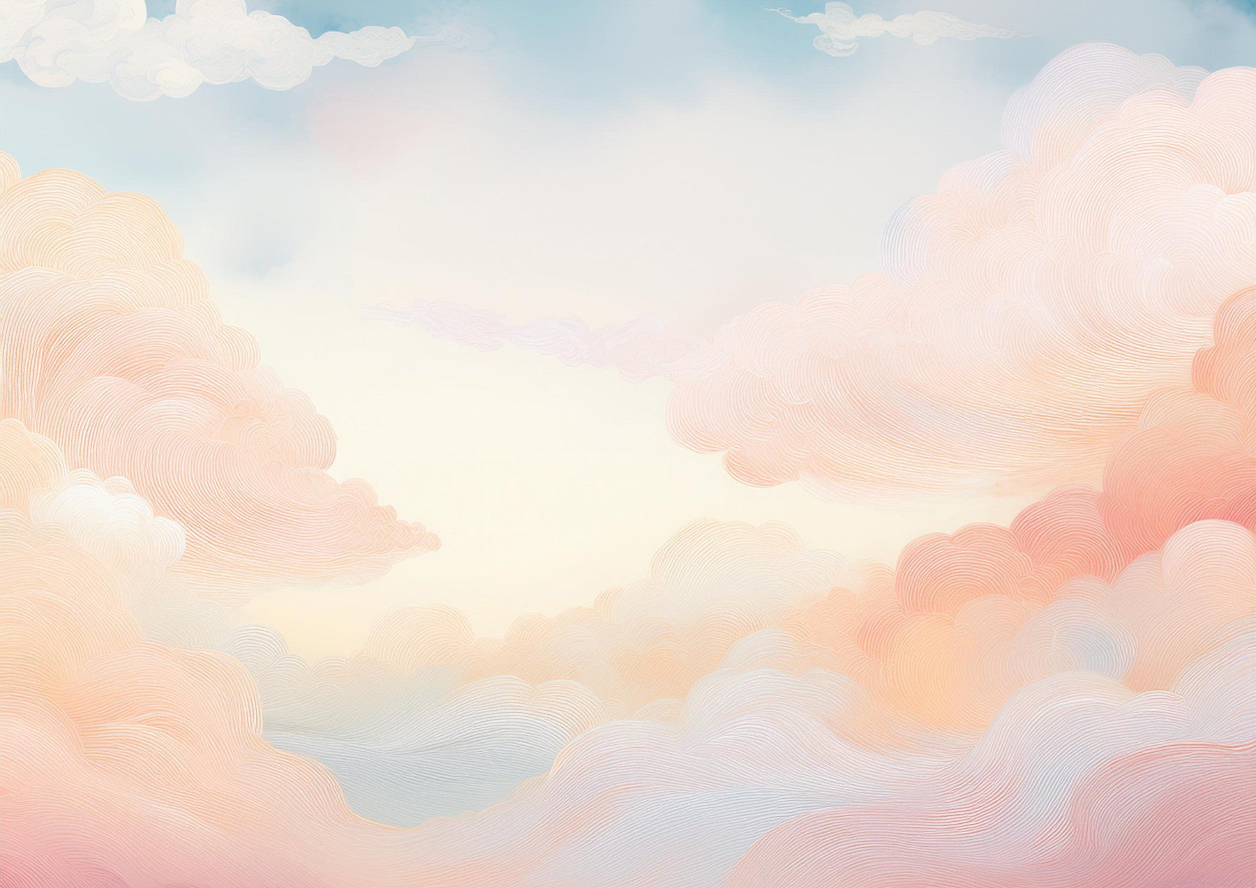 Awaken to the gentle embrace of 'Soft Sky Serenity,' a wallpaper design that captures the soft glow of a new day. The image features a breathtaking panorama of clouds rendered in delicate, swirling lines. Pastel shades of peach, blush pink, and soft blue create a calming and inviting ambiance, perfect for bedrooms and living spaces. The subtle variations in color and texture add depth and intrigue, transforming your walls into a tranquil sanctuary. Embrace the soft, ethereal beauty and start each day feeling refreshed and peaceful.