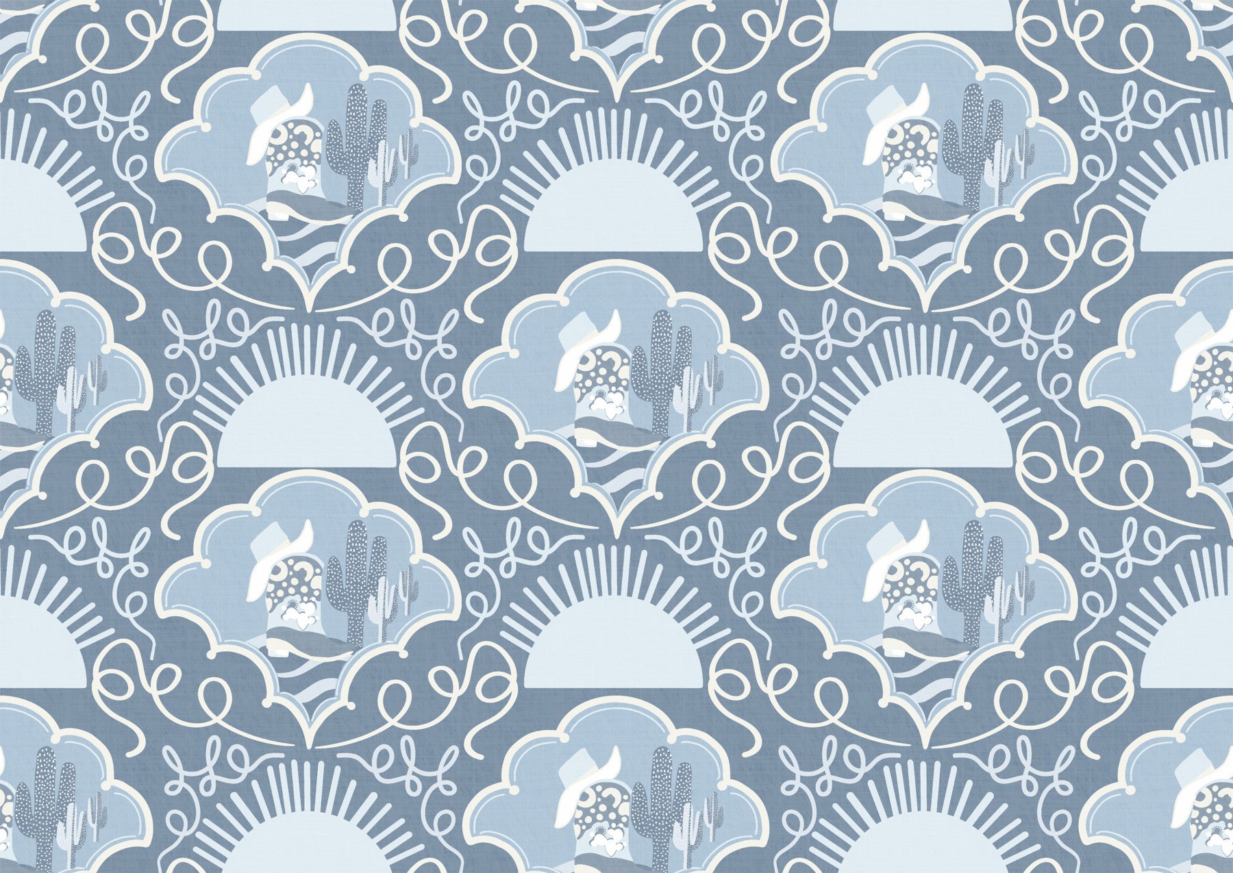 Bring the warmth of the Southwest into your home with Southwestern Serenity, a beautifully illustrated wallpaper design featuring hand-drawn cacti, cowboy hats, sunbursts, and desert details. Set against a soft grey-blue or light denim background, this print offers a gentle, textured feel that calms the eye while adding personality to your space. Perfect for creating a peaceful bedroom retreat, a cozy reading corner, or an inviting entryway. The folk-art charm and earthy palette blend effortlessly with bohemian, rustic, farmhouse, or modern décor styles. Whether you’re refreshing a single wall or creating a themed room, this design brings a subtle desert soul to any interior.