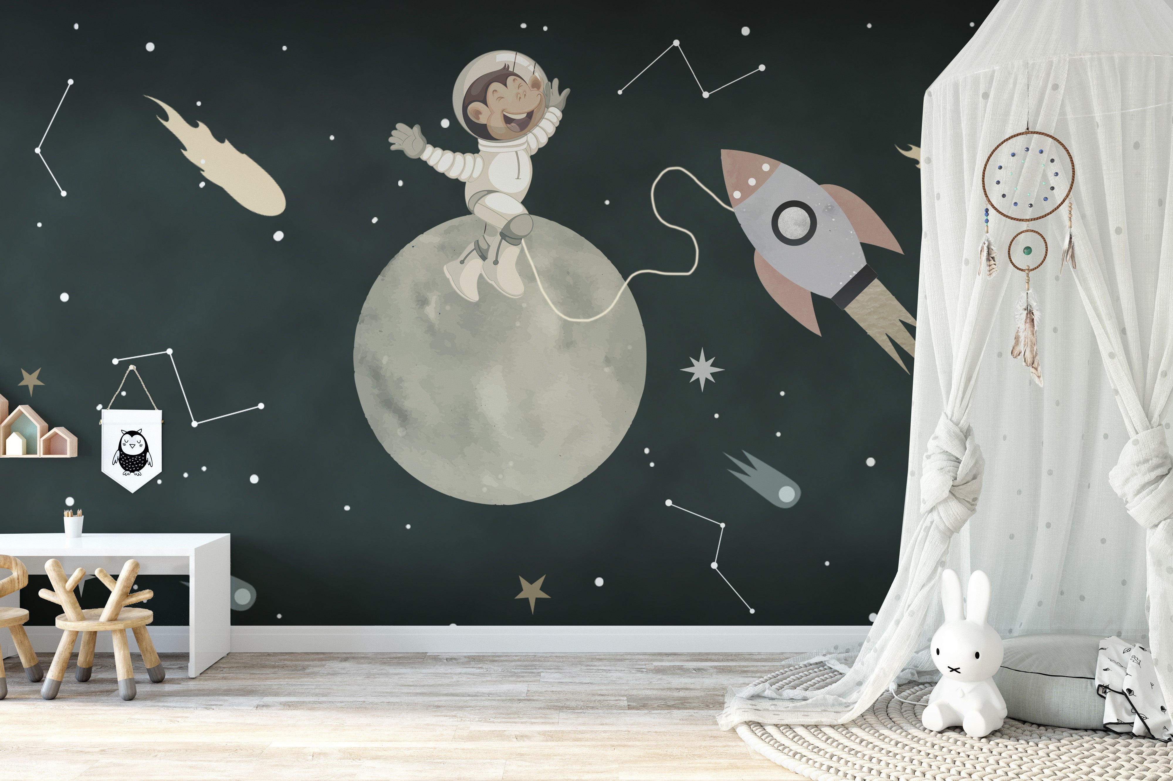 Blast off to interstellar dreams! Our space pup odyssey wall mural captures the spirit of adventure among the stars. Perfect for young astronauts, this kids space wallpaper brings a cosmic canine's journey to your child's room. Watch their eyes light up under a canopy of twinkling stars and playful planets. This mural isn't just decoration it's a backdrop for a universe of stories waiting to unfold in the imaginations of little space explorers.