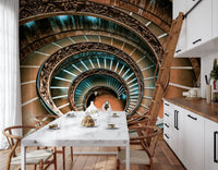 Transform your space with this grand spiral staircase design. Elegant carvings and an inviting color palette create a focal point on any wall. Earthy browns blend with a cool turquoise to evoke a sense of classic sophistication. The spiraling composition adds depth and dimension, making smaller rooms feel larger. Install this majestic wallpaper for walls in living rooms, hallways, or dining areas to bring timeless beauty and refined artistry to your home. It elevates any interior with architectural intrigue.