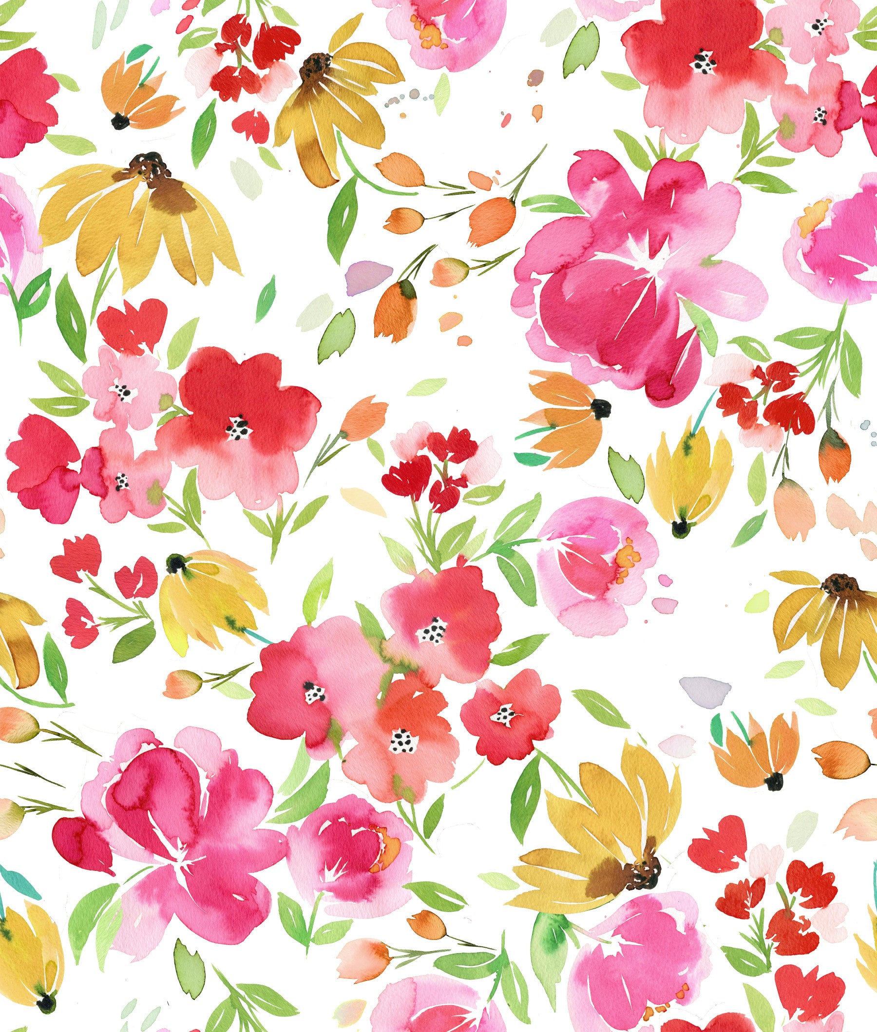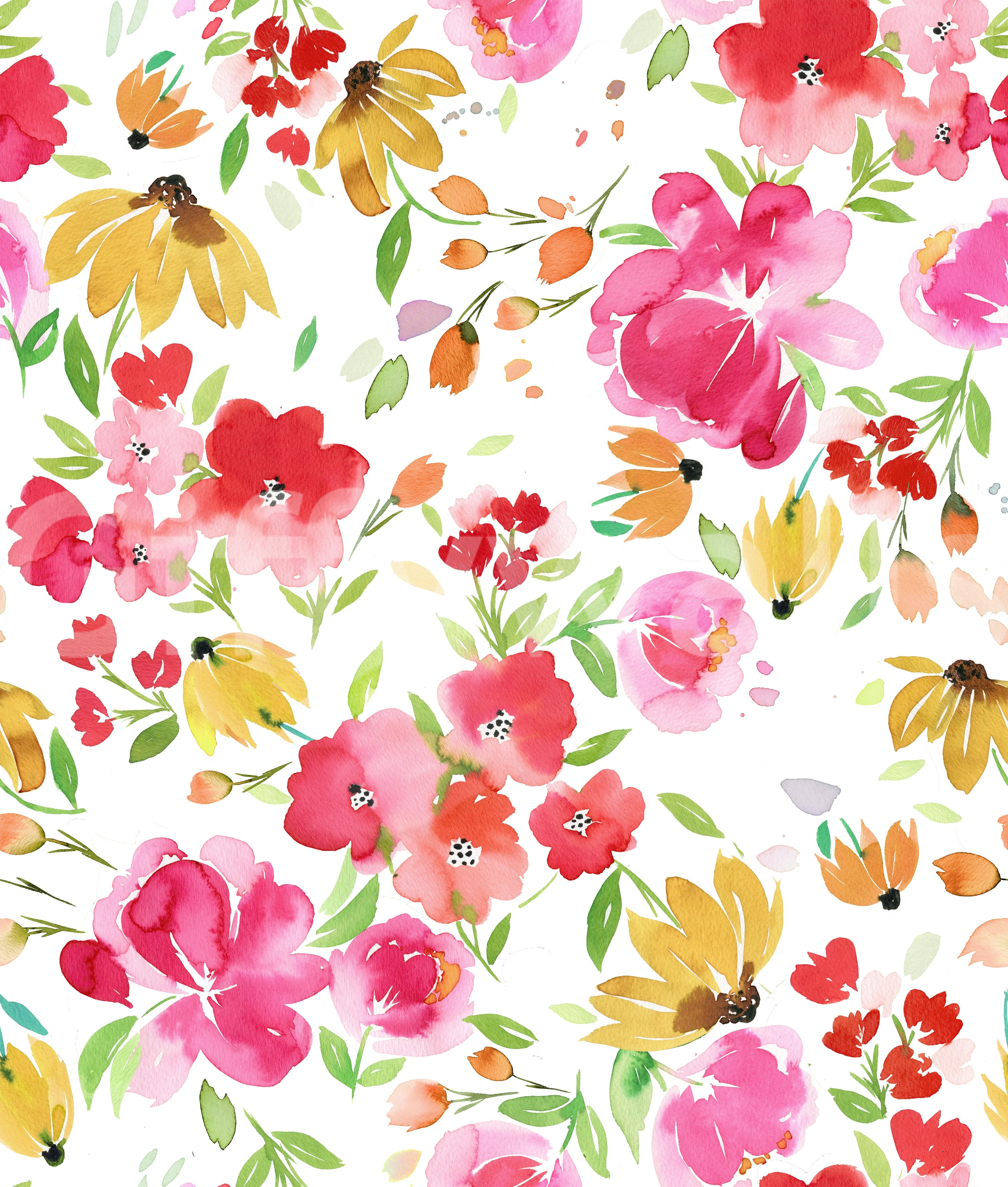 Embrace the vibrancy of spring with this watercolor floral wallpaper. A delightful array of pink and yellow blossoms dances across a crisp white background. Loose, expressive brushstrokes capture the delicate beauty of peonies, daisies, and smaller wildflowers, creating a feeling of effortless springtime charm. The cheerful color palette and airy design infuse any space with a fresh, optimistic mood. Perfect for adding a touch of natural elegance to your digital devices.