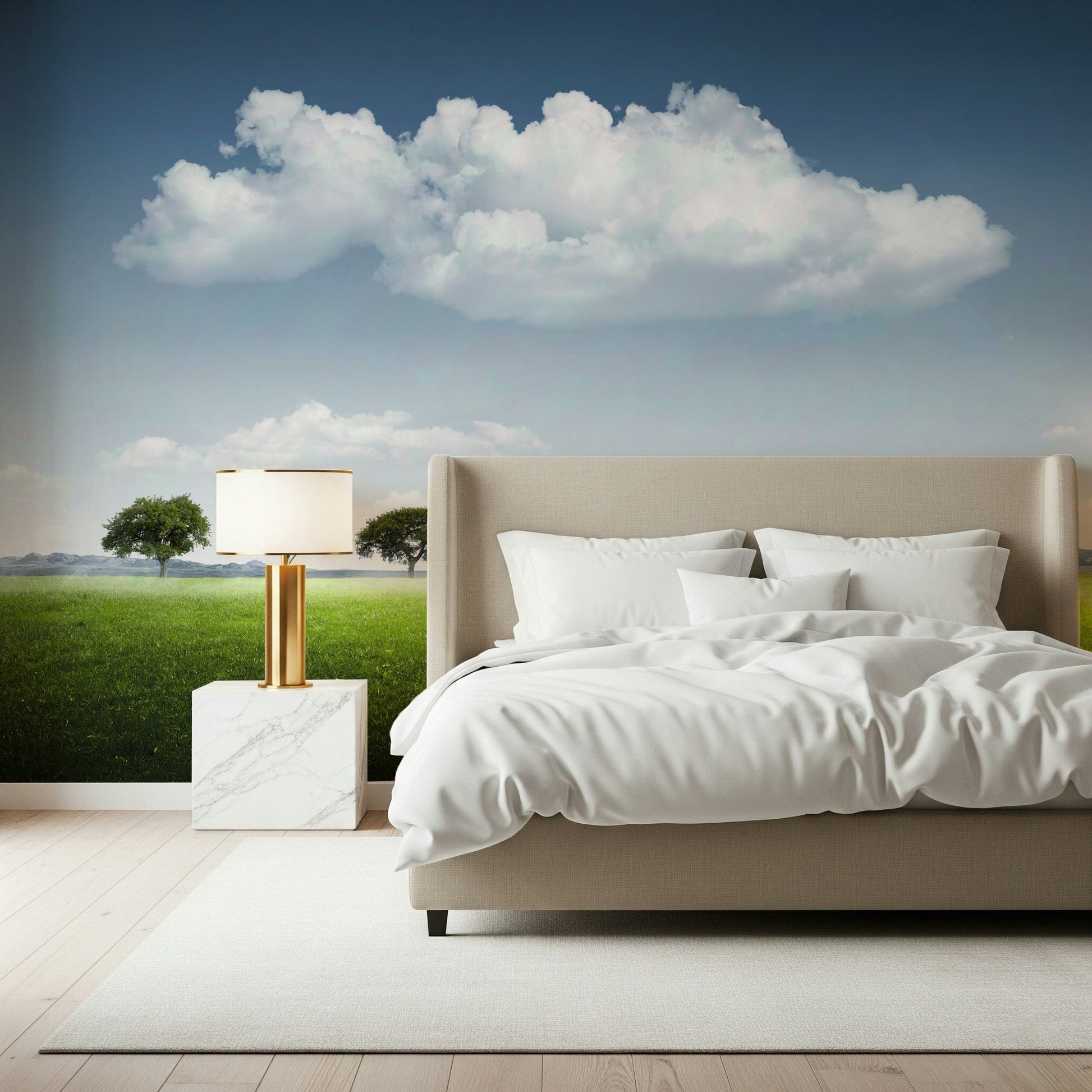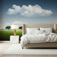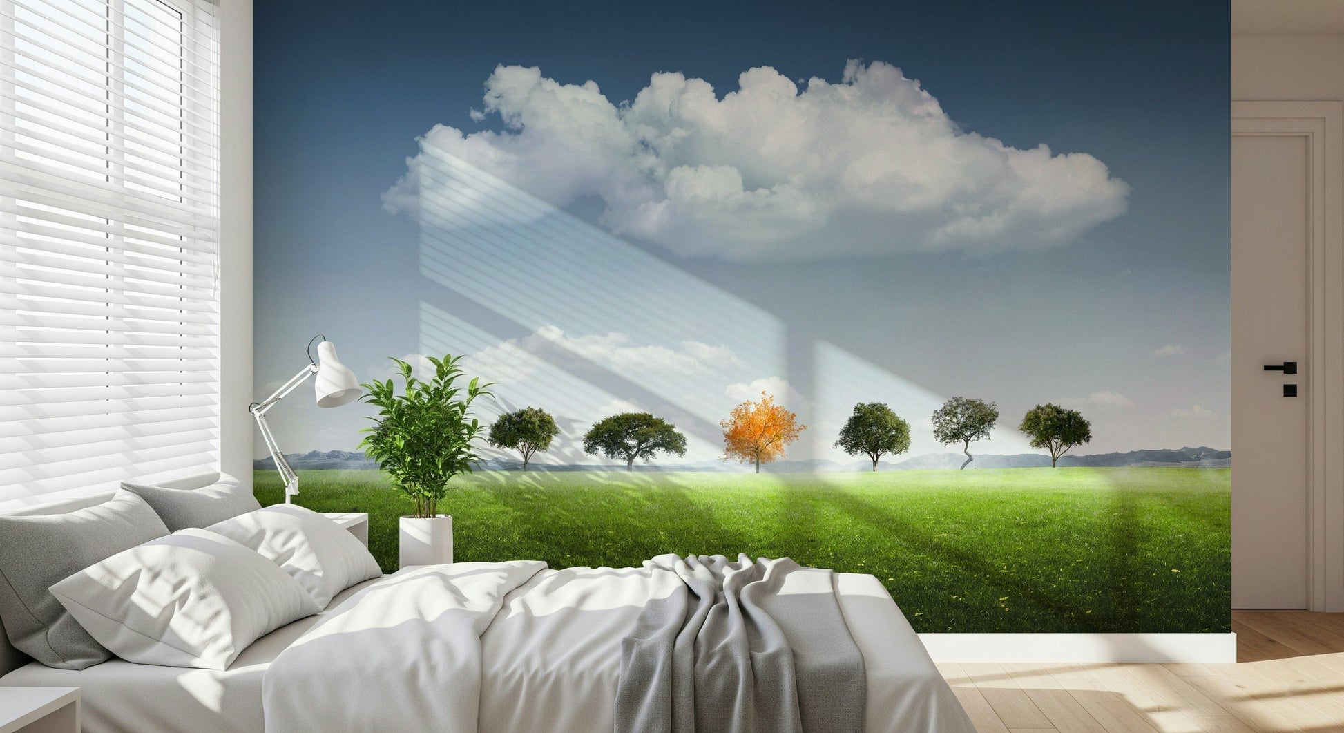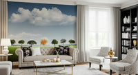 Showcase a calm, green vista with bright blue sky for a relaxing interior. Featuring a line of trees in a grassy field, this wallpaper design has the right balance of calm and unique colors. This wallpaper for walls makes a bold statement. Use it in your living space, home office, or bedroom for a peaceful feel. The orange tree contrasts beautifully against the green and blue and enhances modern interiors.