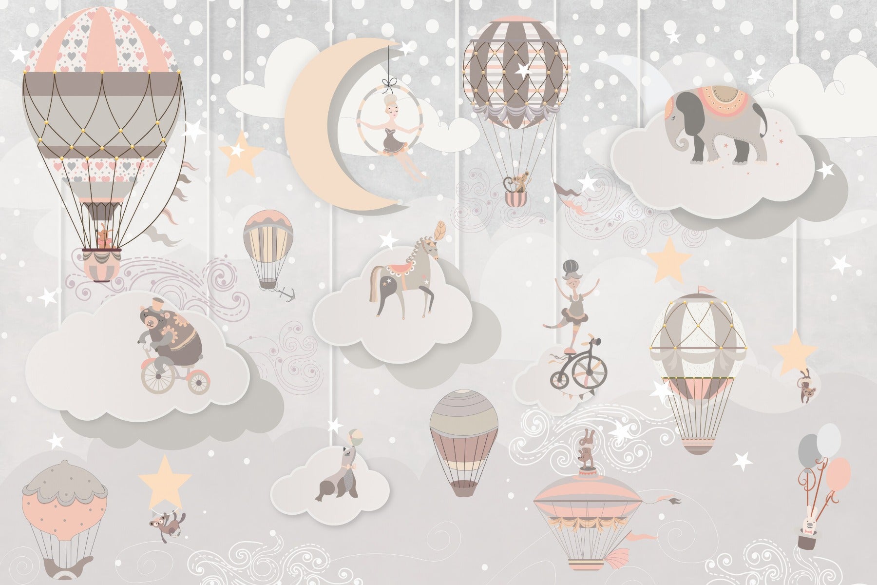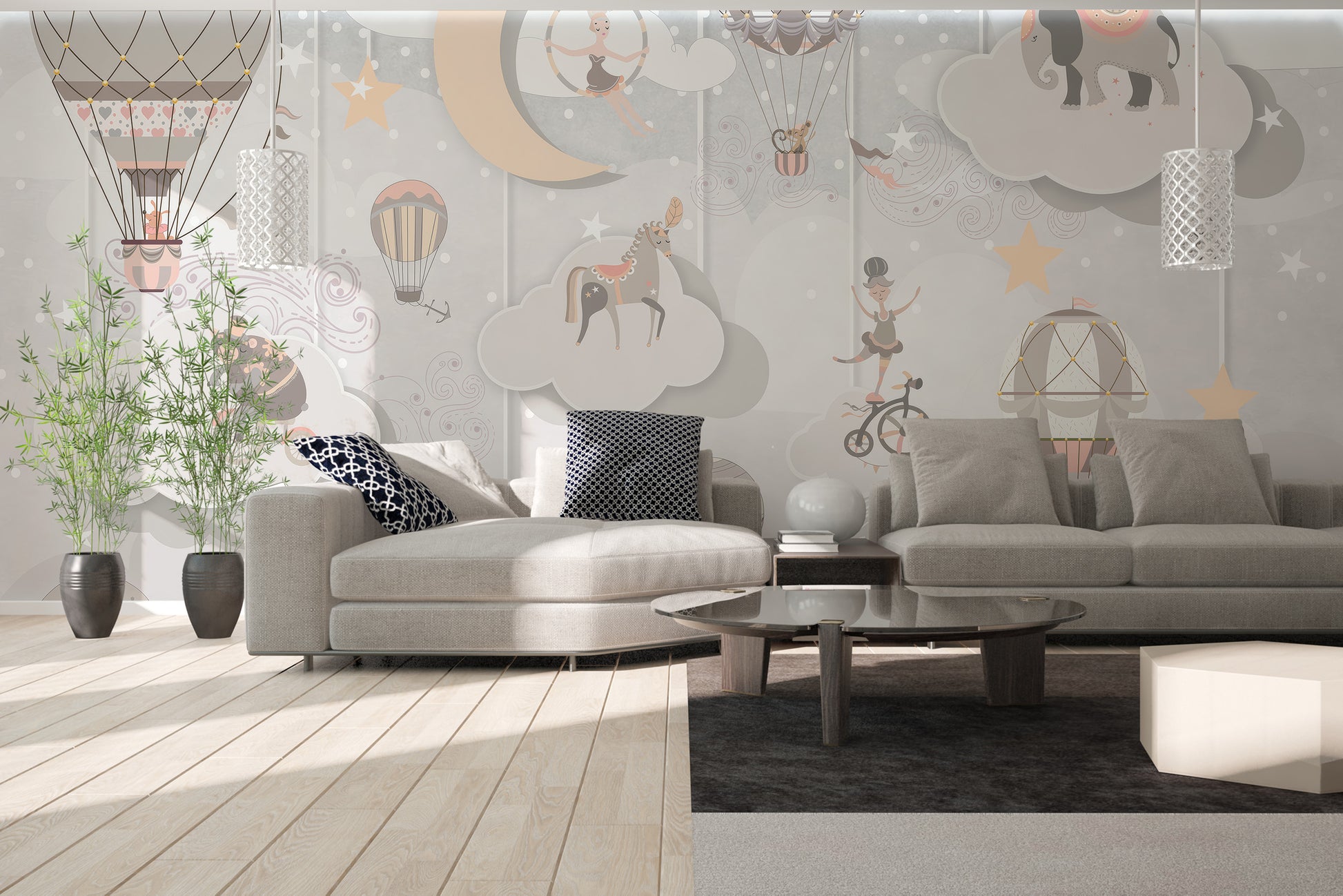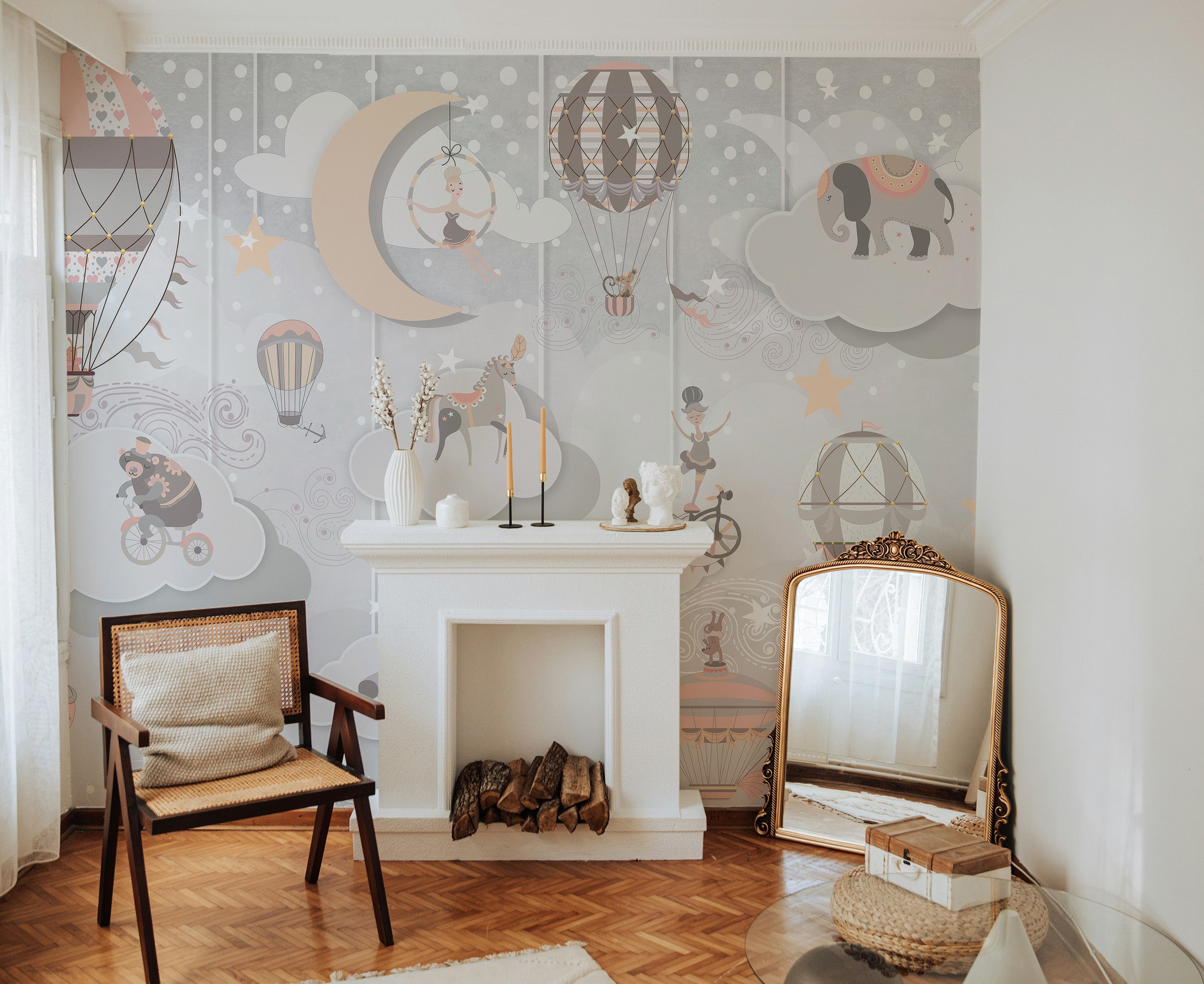 Welcome to a realm where whimsy meets wonder a place where nursery wallpaper isn't just a covering but a gateway to worlds of imagination and play. The starry circus spectacle mural invites tiny dreamers to soar among clouds and stars with a vibrant cast of circus characters. Each brushstroke tells a story of adventure and enchantment, as elephants parade on soft clouds and daring cyclists perform high above in the serene night sky. Crafted for the curious and the young at heart, this mural becomes the backdrop for childhood tales, where every glance sparks a new narrative. Wrap the walls of a little one’s room in this magical scene and watch as it becomes the favourite chapter in their day.