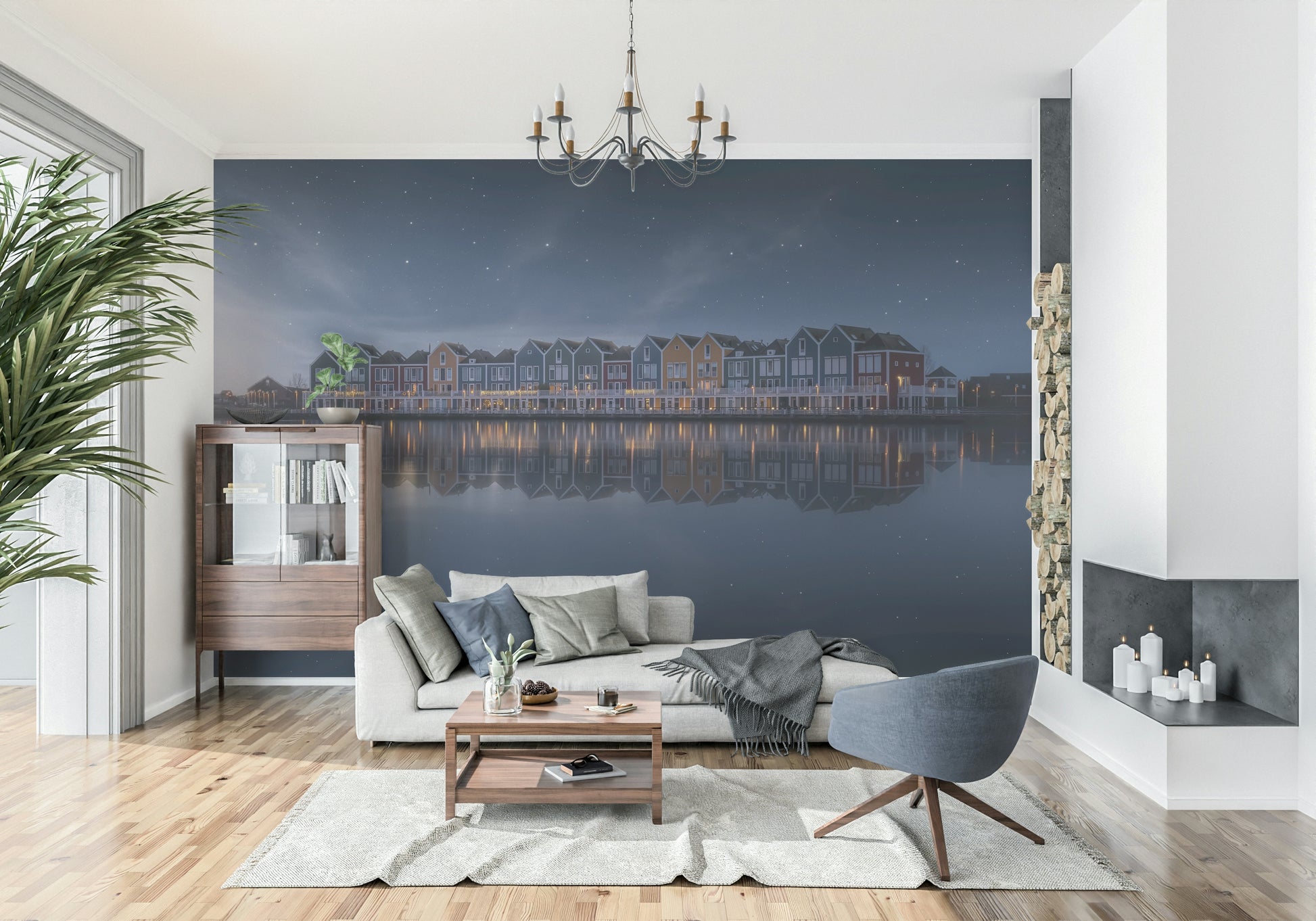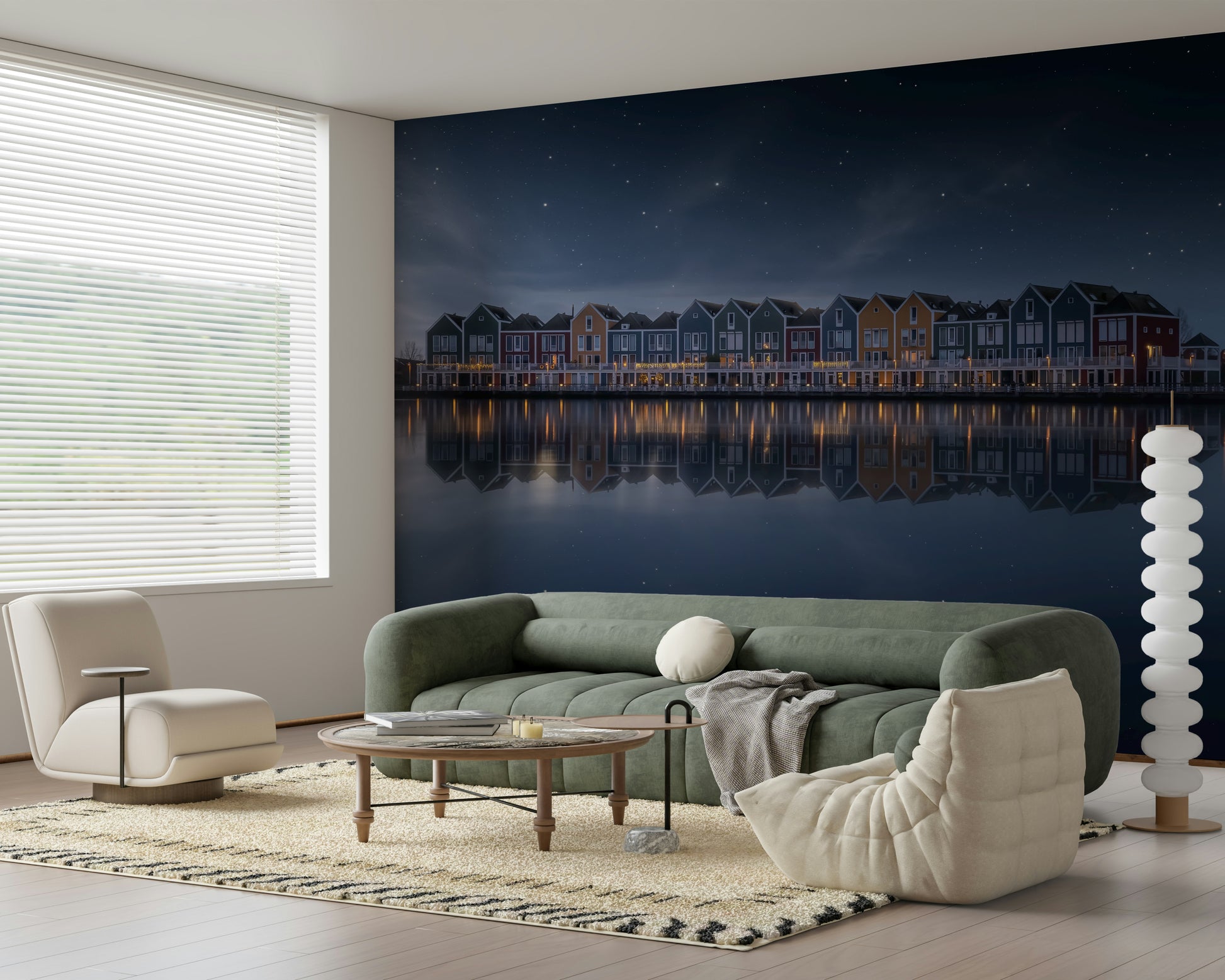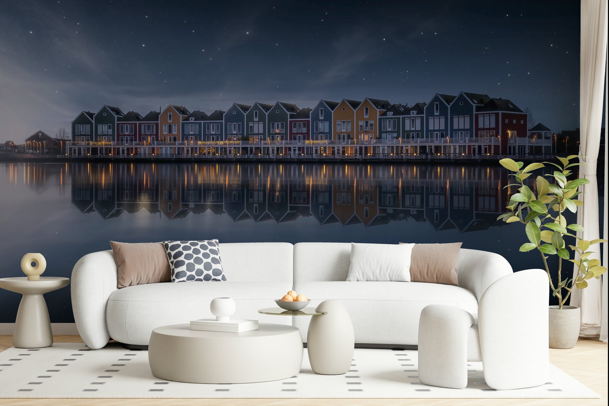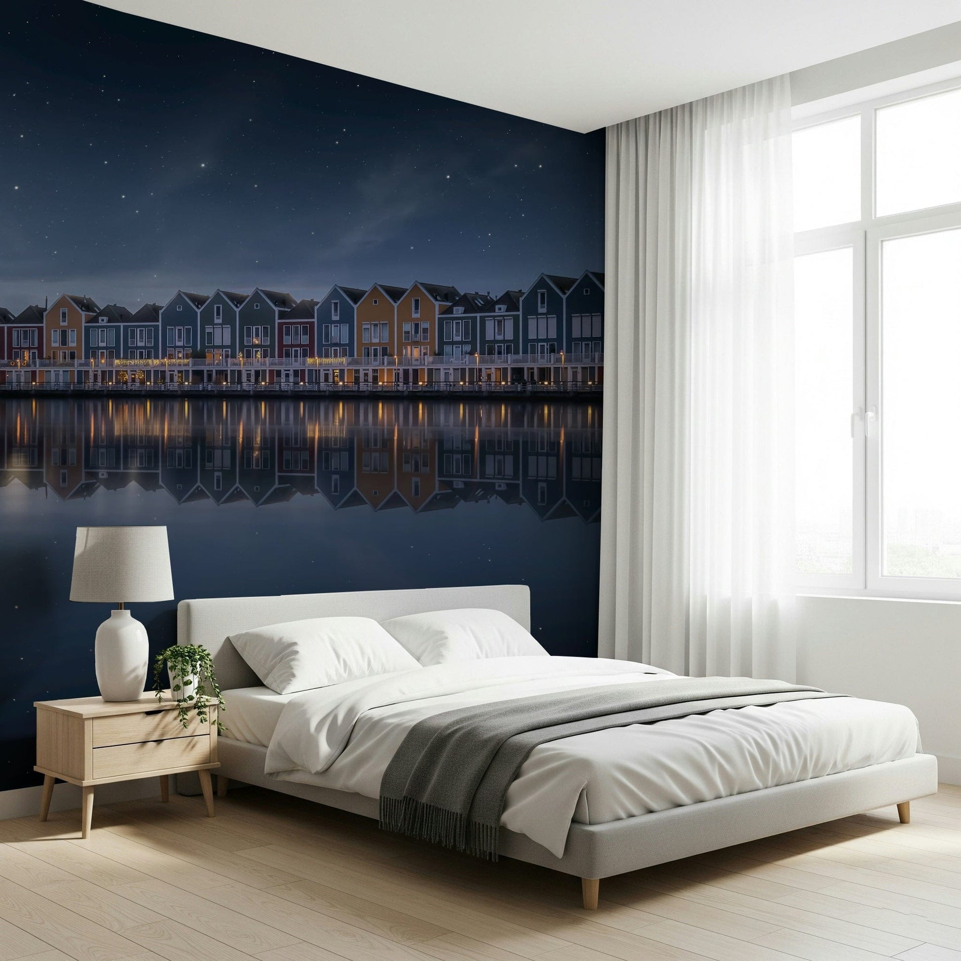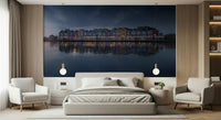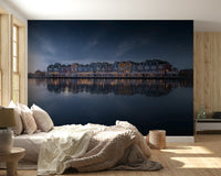 Observe the tranquility of a serene night. This image displays colorful houses reflected in calm waters beneath a starry sky. Gentle hues of blue, green, red, and orange create a peaceful scene. This wallpaper for walls works excellently in a bedroom or living room. The reflections and star-filled sky introduce a sense of calm and depth. It creates an inviting atmosphere and also suits a hallway or office, adding a touch of sophisticated charm to any interior.