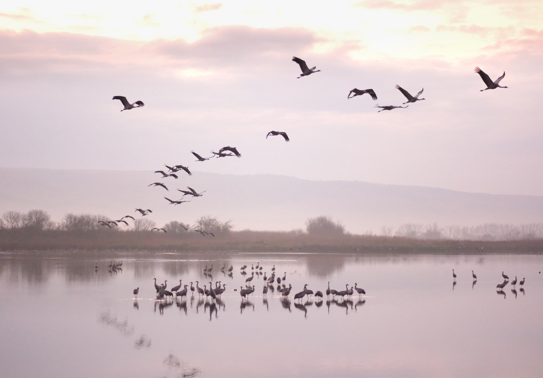 Embrace the beauty of nature with this captivating wallpaper image. It features cranes resting and flying over a still lake at dawn. The pastel color palette creates a serene and relaxing atmosphere, perfect for creating a peaceful ambiance in any room. The neutral tones ensure this wallpaper for walls blends seamlessly with various decor styles. Use this design in the bedroom to create a relaxing retreat, or in the living room or office for a nature-inspired accent.